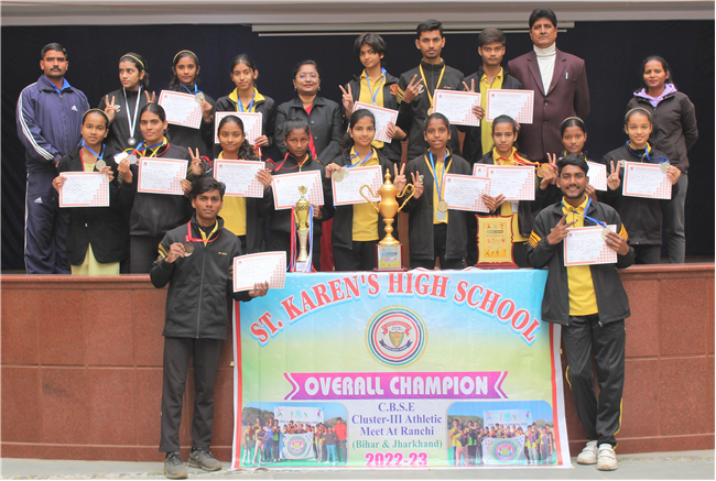 St. Karen's High school was declared champion in CBSE Cluster Athletics Meet -2022. The students won Gold medal in 200mts, 400mts, High Jump, 4x100 mts Relay. 4×400mts Relay and 1500 mts. The students won silver and bronze in various categories as well.