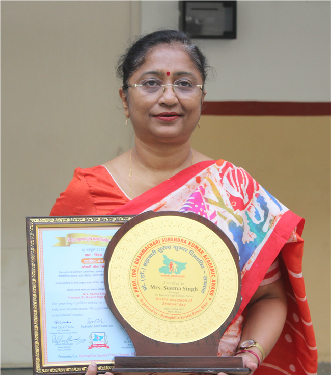 The principal Mrs. Seema Singh was awarded by the Haemophilia Society of Patna, for her contribution in the field of education on 15th October 2022.