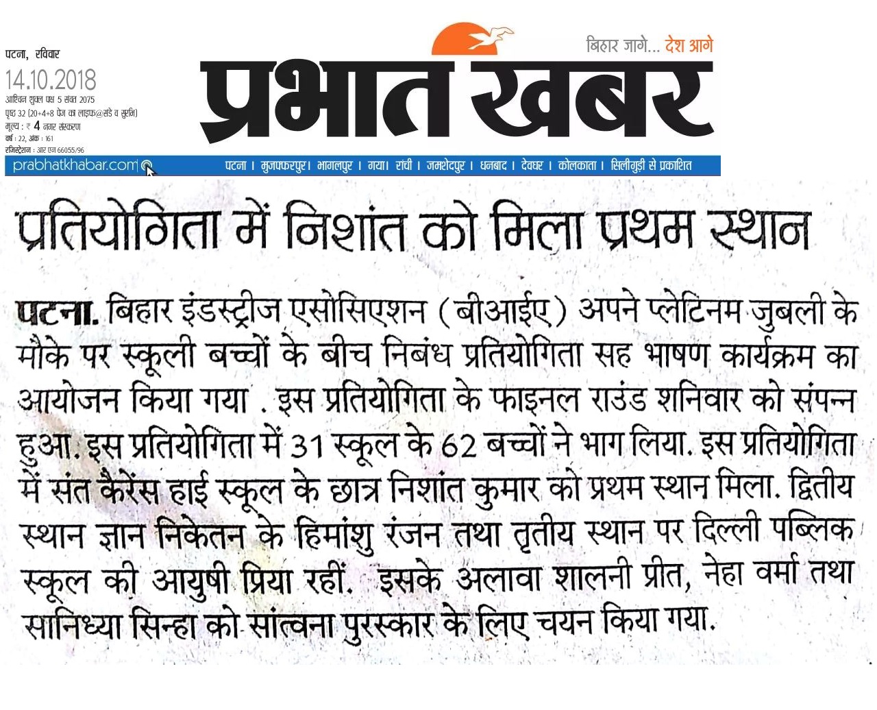 Bihar Industries Association (BIA) ne apne Platinum Jubilee ke mauke par schooli bacchon ke beech nibandh pratiyogita sah bhashan kryakram ka aayojan kiya gaya.Iss pratiyogita me St. Karen's High School ke Nishant Kumar ne 1st position haasil ki.