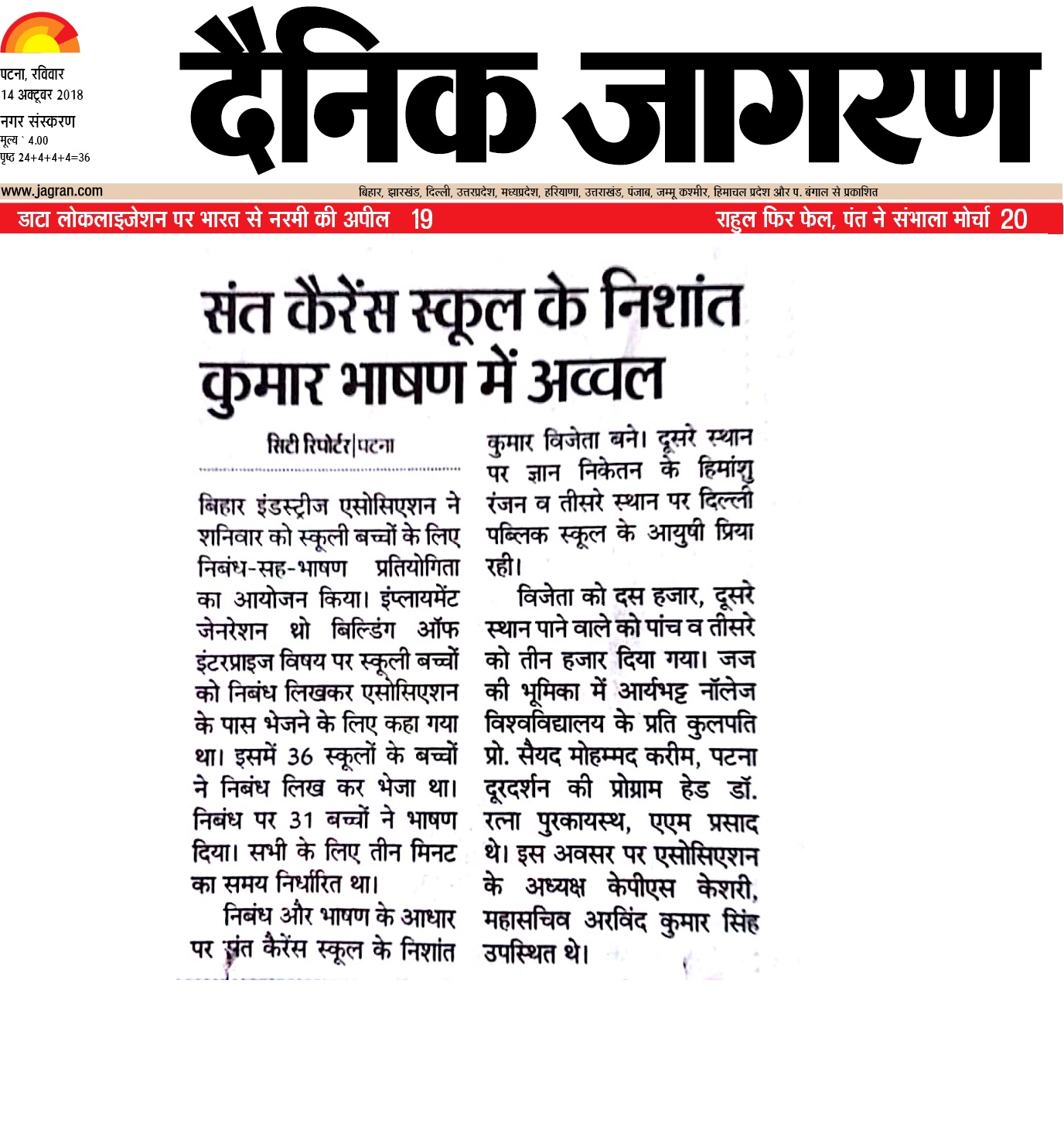 Bihar Industries Association ne shanivaar ko schooli bacchon ke liye nibandh sah bhashan pratiyogita ka aayojan kiya. Nibandh aur Bhasan ke aadhar par St. KAren's School ke Nishant Kumar vijeta bane.Vijeta ko 10 hazaar diya gaya.