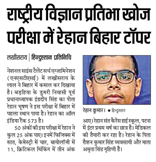 Rehan Bhushan of class XI C bagged 'State Rank 1'in National Science talent Search exam