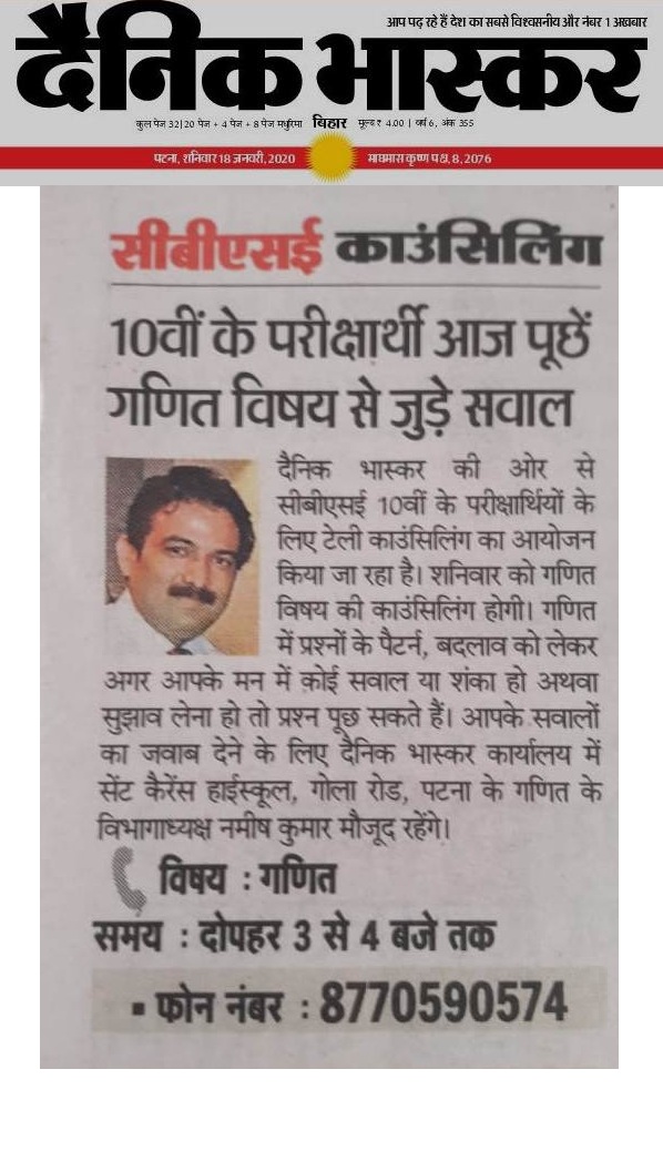 Students of class 10th can ask questions related to the board examinations. This tele-counselling was organised buy Dainik Bhaskar, and was conducted by Namish Kumar, HOD of Maths Dept., St. Karen's High School, Gola Road, Patna.
