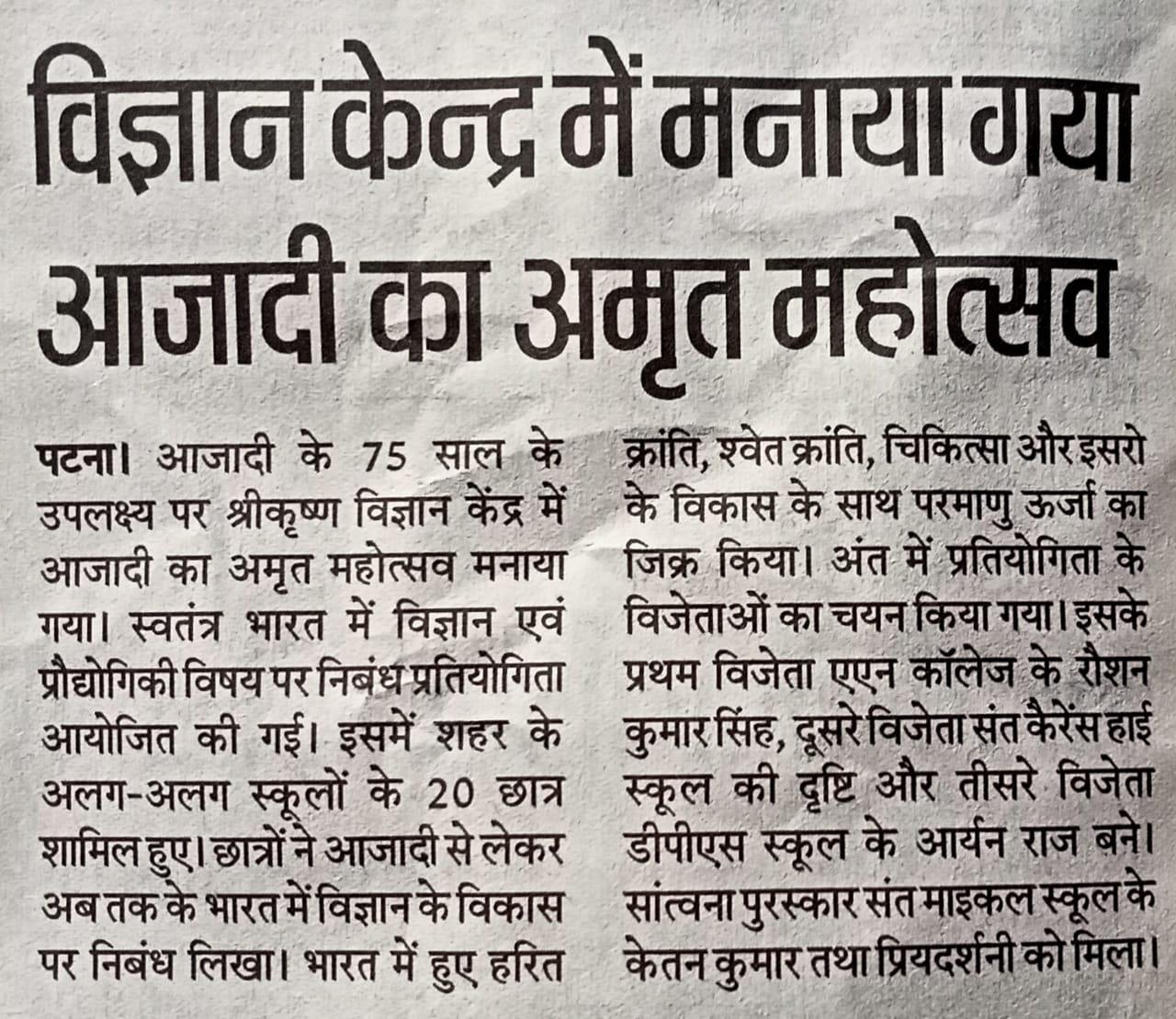 An inter-school essay writing competition was organised by Sri Krishna Science Centre on the topic 75 years of Development of Science and Technology in Independent India on 27th July 2021. Dristi of class XII F received the Second Prize in the competition.