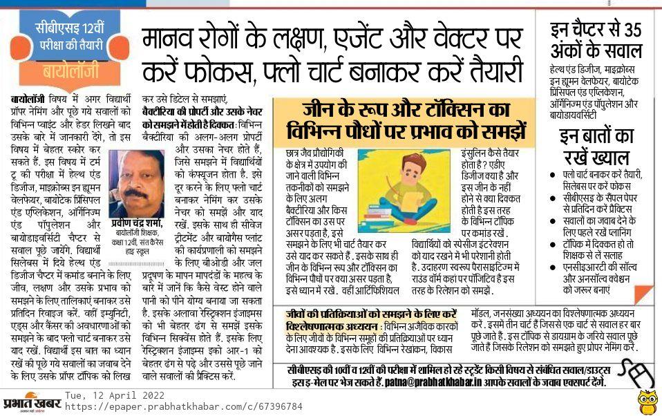 Mr. P.C Sharma an experienced teacher of +2 in St. Karen’s high school guided the student readers of Prabhat Khabar regarding Biology Term 2 Cbse exam preparations. He stressed that Flow Charts and tables of the chapters related to Human diseases should be prepared.