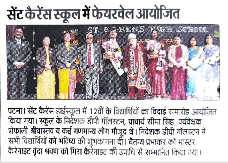 The farewell ceremony of standard 12th (session 2022-23) was held in the premises of St. Karen's high school. The event organized on 03rd February, 2023 was high on fun quotient as the seniors enjoyed their special day . Young girls sashayed around in their vibrant red attire while the boys looked dashing and handsome in their formal suit. Students were warmly welcomed by the teachers who blessed them by applying tilak and ushered them in. The lighting of the pious ceremonial lamp by the director of the school D.P. Galstaun, Academic Supervisor Shefali Srivastava, Principal Seema Singh and plus two in-charge Michael Pushpa Nayagam marked the inauguration of the farewell ceremony. The director of the school addressed the students and motivated them to pursue their dream with strong will power and sheer determination. The council members handed over their sashes to the director sir. The Farewell speech by the succeeding batch left the students and teachers tearful. Being grateful is the key to become successful. The outgoing batch thanked the institution and its members for their crucial and unforgettable role in shaping their future. The principal of the school Mrs. Seema Singh encouraged the students with her impassioned speech. The performance by the succeeding batch was the most exciting part of the programme as the girls set the stage on fire by their scintillating dance performance. The school band rocked the stage with their pulsating music. The outgoing students participated enthusiastically in various exciting games and the winners were awarded. Regularity is the key to perfection in any art. The students were also awarded for highest marks, full attendance etc. The much-awaited part of the auspicious farewell ceremony was the distribution of the titles. The most coveted award of Miss and Mr. Karenite went to Chaitanya Prabhakar and Vrinda Vidisha respectively. Finally, the students parted after taking blessings of their teachers who wished them good luck for their upcoming future. The valedictory ceremony marked the beginning of a beautiful ending.