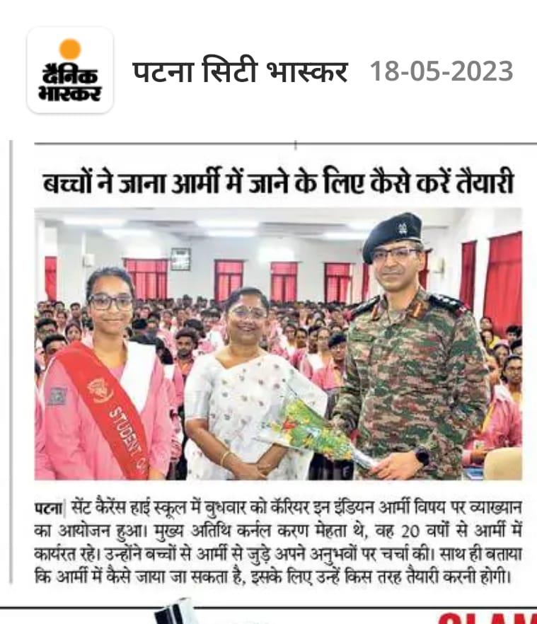 A workshop about career in the Indian Armed Forces was organised by St.Karen’s High School at the school auditorium on 17th May, 2023. The event started with a standing ovation given by the students of class 12th and the teachers as the chief guest and speaker Colonel Karan Mehta stepped on the stage to address the audience. The colonel introduced himself as a 4th generation army officer who is a satellite analyst and a leading officer in the ‘Armoured Corps’ of T72 tanks at the Siachen Glacier. An in depth knowledge about the Indian Army was given to the students. A variety of related topics were discussed. The presentation started with the qualities and eligibility needed by the students to be accepted into the army. Then it continued with the benefits received by it and necessary tips and steps to be taken to pass the gruelling entrance examinations. Finally, the presentation concluded with the motivational words of the colonel. The programme concluded with a question and answer session organised by the students and the words of appreciation by the principal. Seeing the enthusiastic response and participation of the students, the colonel expressed his gratitude and hoped to visit our school again in future.