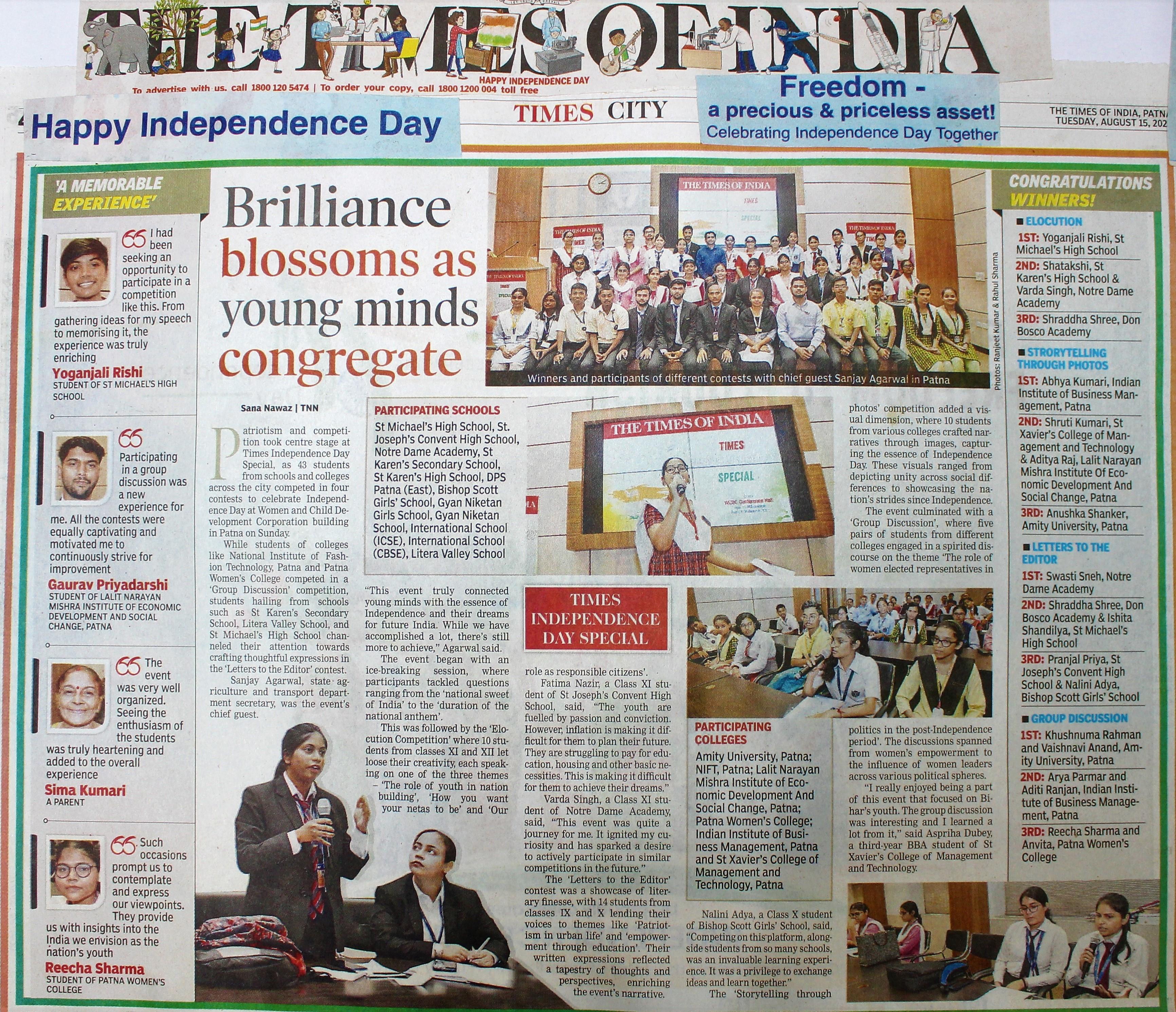 'TIMES INDEPENDENCE DAY SPECIAL' CONDUCTED BY THE TIMES OF INDIA ON 15TH OF AUGUST 2023 WHERE SHATAKSHI WHO WON 2ND PRIZE IN INTERSCHOOL ELOCUTION CONTEST.