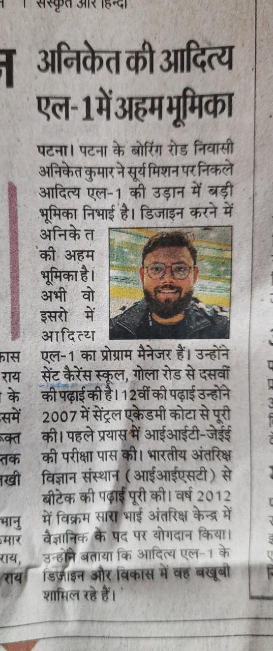 Aniket Kumar who was in the team of Chandrayaan 3 played an important role in the making of Aditya L1. Currently he is the programme manager of Aditya L1 in ISRO. He was a student of St. Karen's High School, 2005 batch of std10.