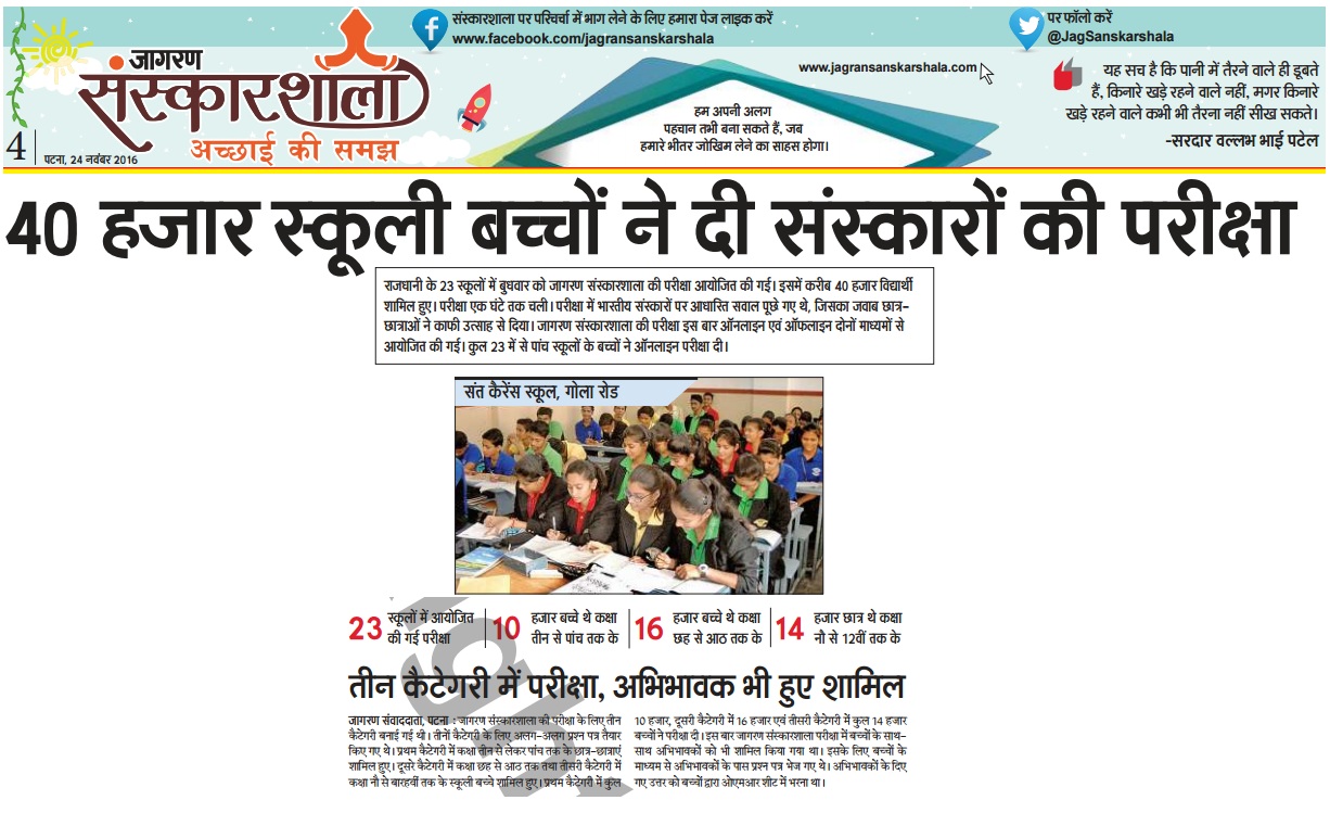 SANSKARSALA exam based on Indian culture and Moral Values was conducted by Dainik Jagran on 24th November 2016. Over 23 schools & 30000 students participated in the big event. Students of standard 3 to 10 of St. Karen’s High School also participated in the same.