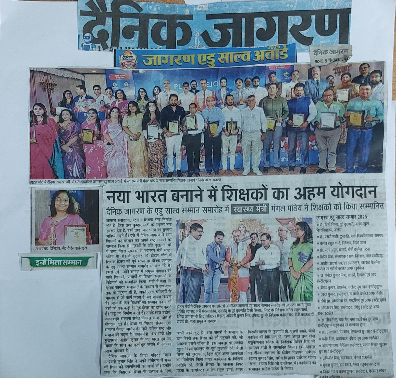 Our Principal, Mrs. Seema Singh was honoured for her contribution in development of education in Bihar at an event organised by leading newspaper Dainik Jagran on 4th September 2025.