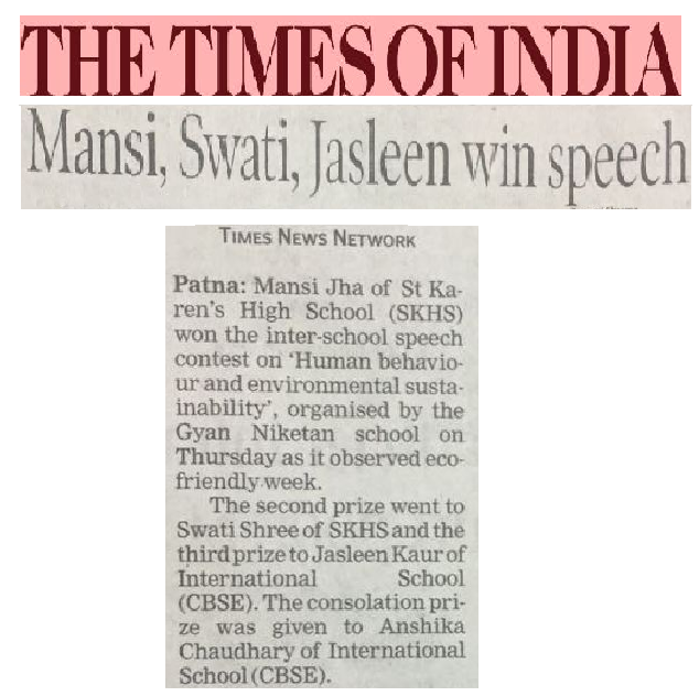 MANSHI JHA OS ST.KAREN’S HIGH SCHOOL (SKHS) WON THE INTER-SCHOOL SPEECH CONTEST ON ‘HUMAN BEHAVIOUR AND ENVIRONMENT SUSTAINABILITY’, ORGANISED BY THE GYAN NIKETAN SCHOOL ON THURSDAY AS IT OBSERVED ECO-FRIENDLY WEEK.