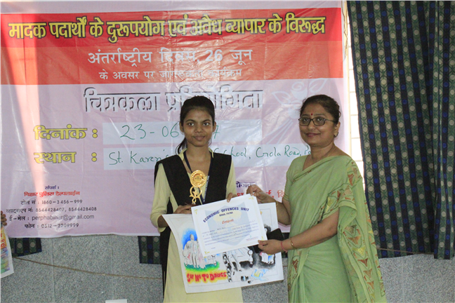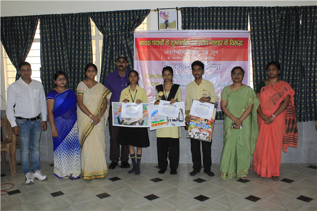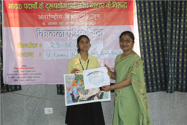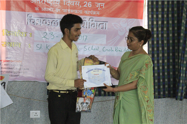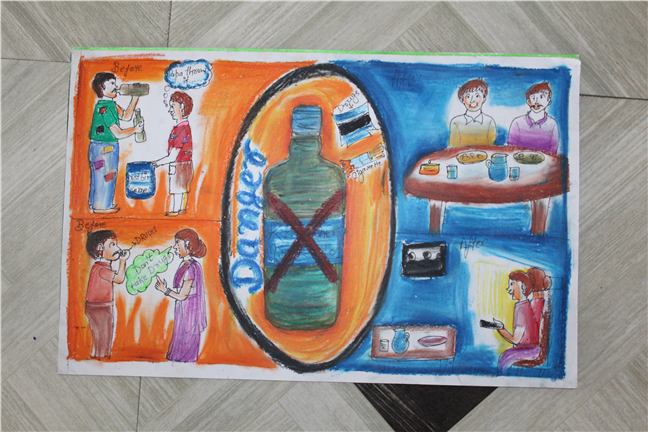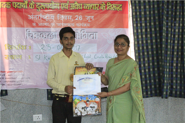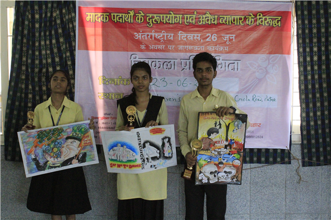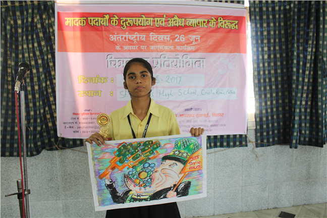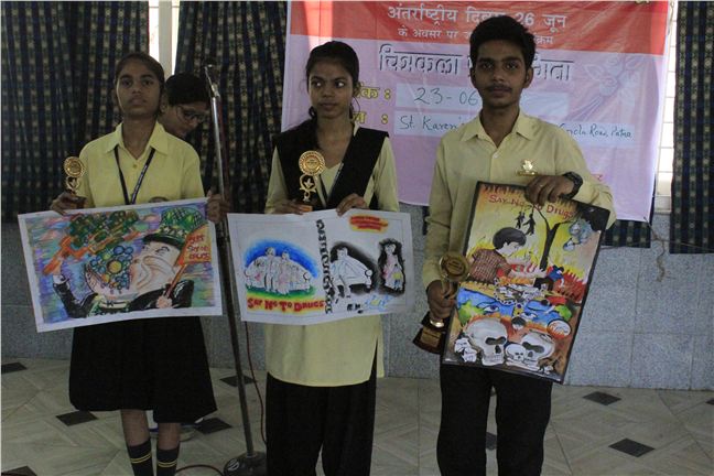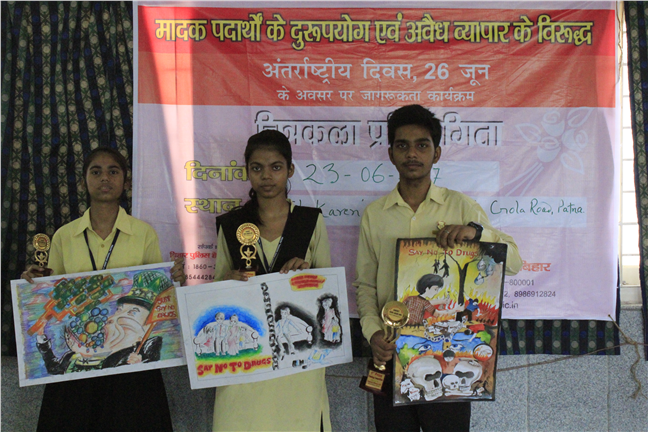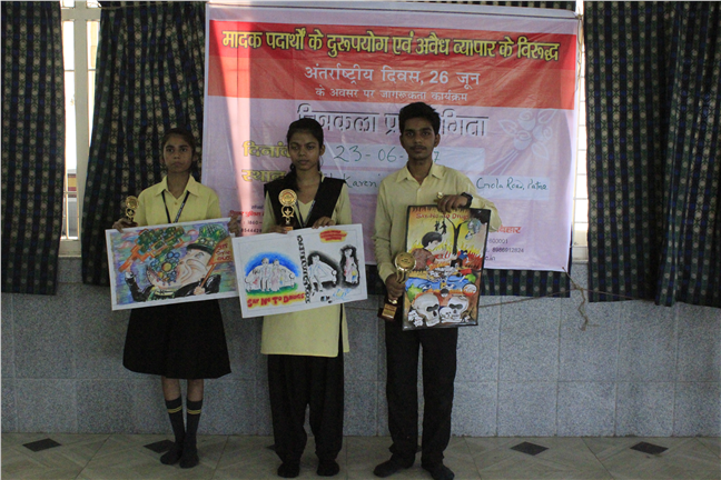 Description: 26th June, 2017 was celebrated as the international day against consumption of alcoholic product and illegal trafficking. To create an awareness among the students our school organised a drawing and debate competition . In the drawing competition the first prize was bagged by Sudhanshu Shekhar of 10-J, Aditi Priya of 9-F won the second prize and Sneha of 7-E won the third prize.The competition created mass awareness among one and all.