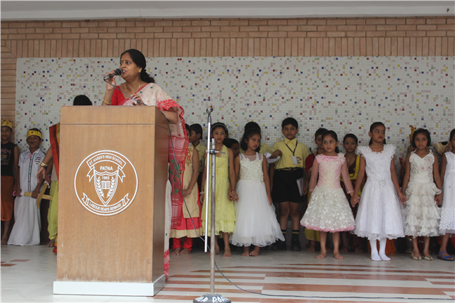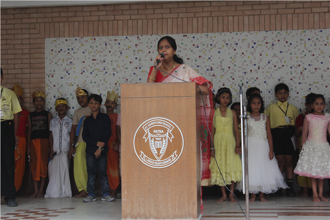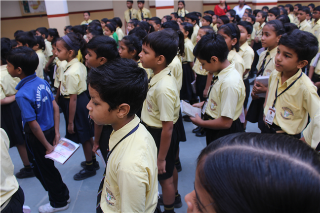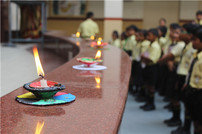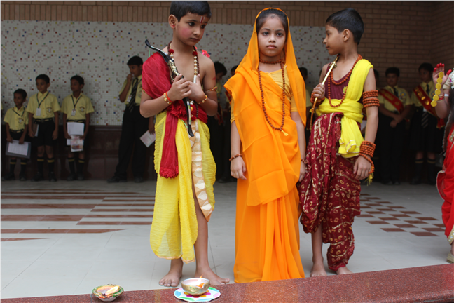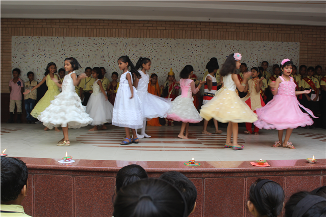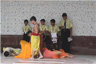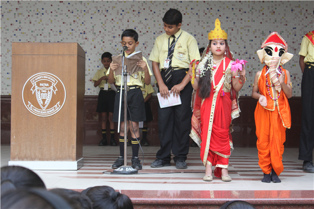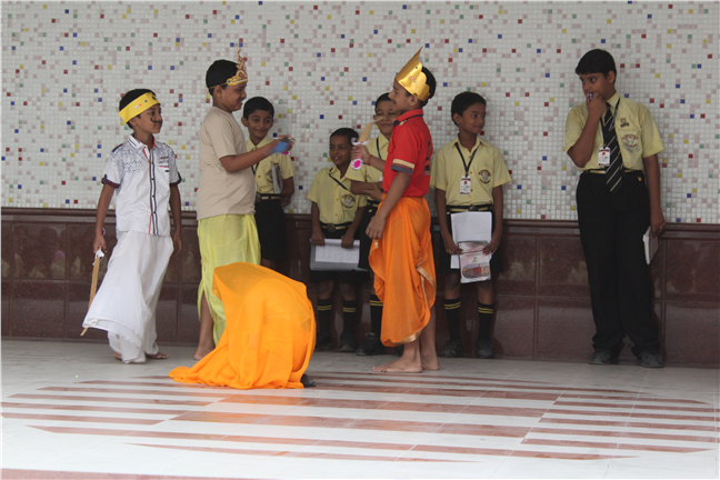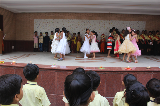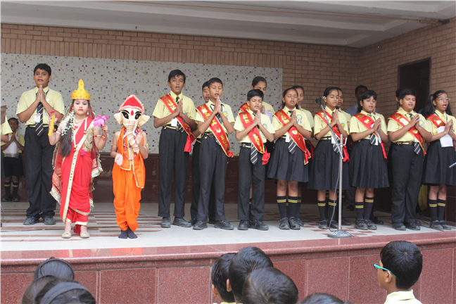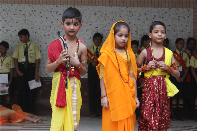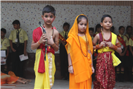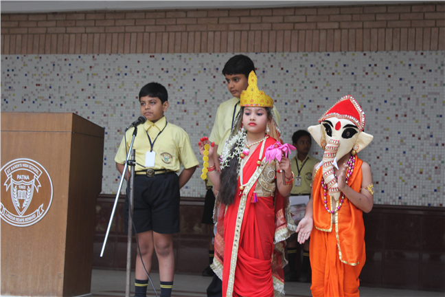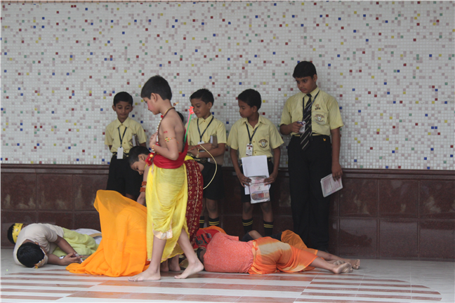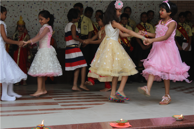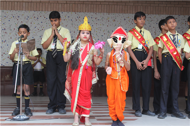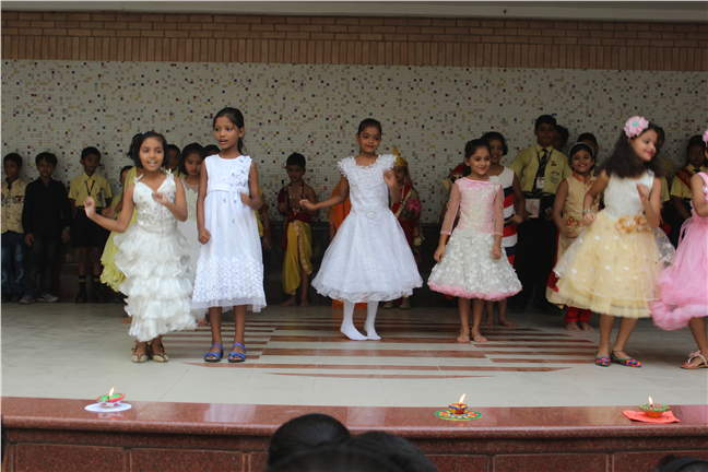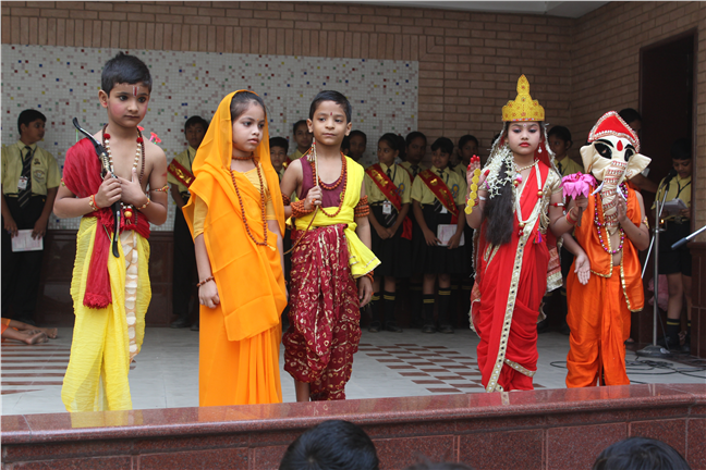 Description: On the auspicious occasion of Deepawali a special, eye catching and full of enthusiasm assembly was conducted by the charming and talented kiddos of Std-II ”A” .They performed their skit based on a Ramayana scene with zeal. The pretty goddess Lakshmi and Ganesha spell bound the audience with their pious appearance on the stage.