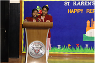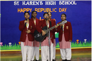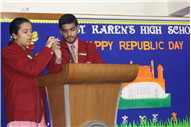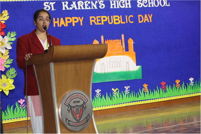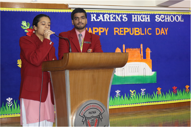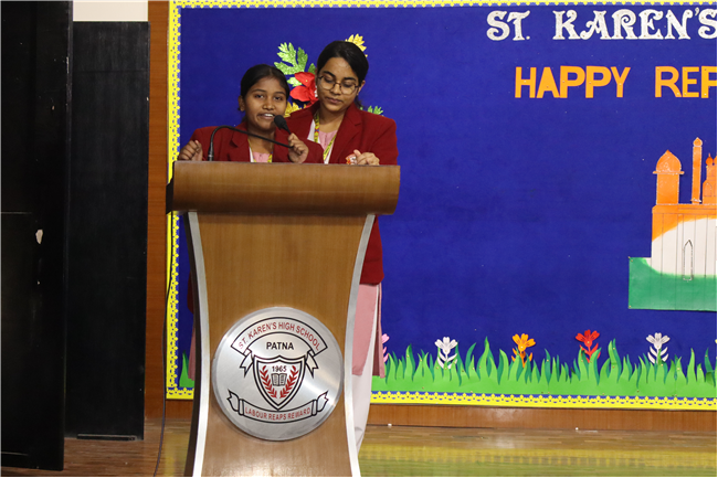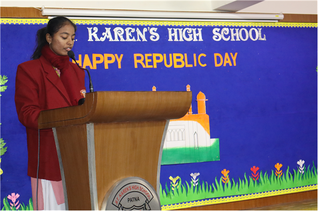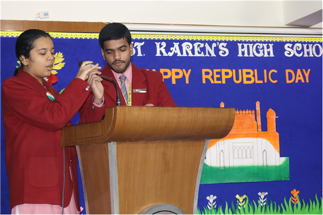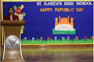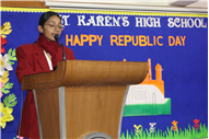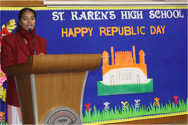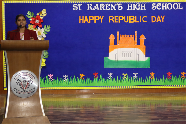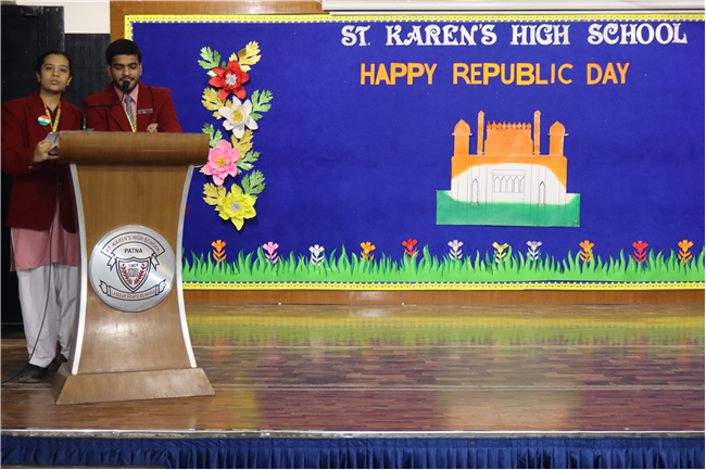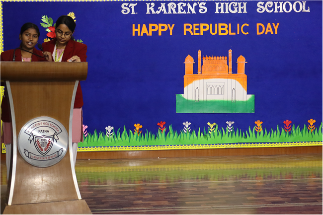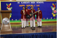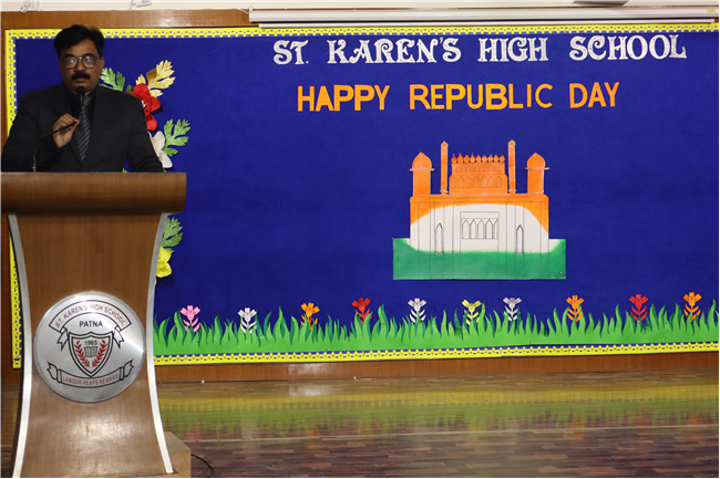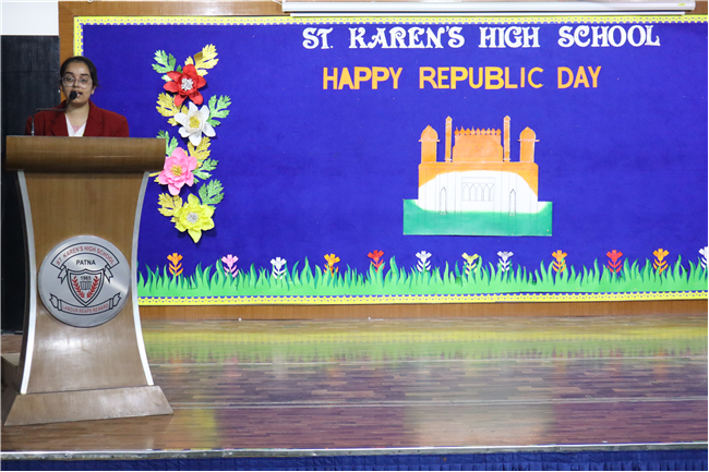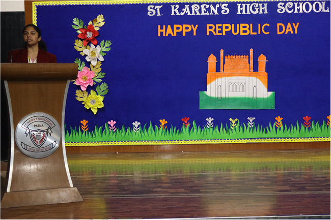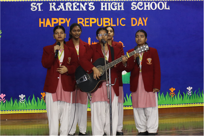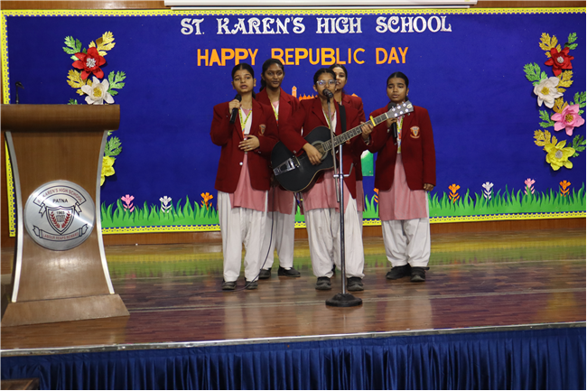 Description: A special assembly was organised by the students of Class 11-E on the occasion of the 76th Republic Day on 24th January 2025. The program featured patriotic poems , inspiring stories of two Param Vir Chakra awardees—Major Somnath Sharma and Captain Manoj Kumar Pandey—and melodious songs performed by the class choir. Unlike other assemblies, this one commenced with the recitation of the Preamble, evoking a strong sense of nationalism among all present. Concluding the event, Vice Principal Mr. Sanjay Joseph praised the students' efforts and took the opportunity to explain the key difference between Independence Day and Republic Day, enriching everyone's understanding of the occasion.