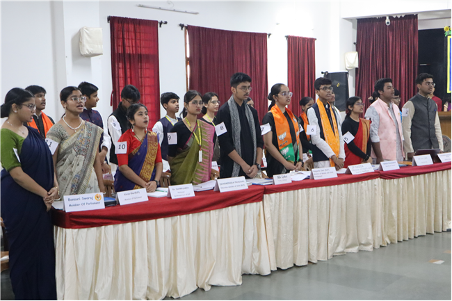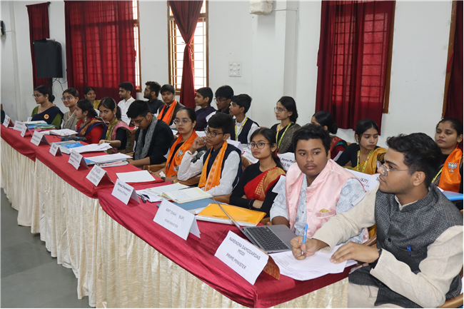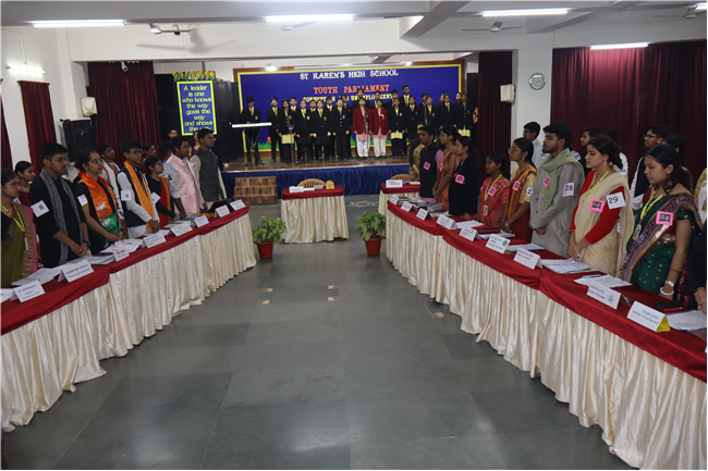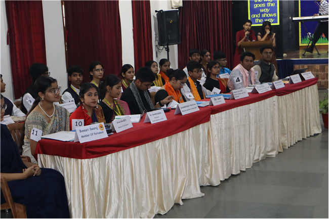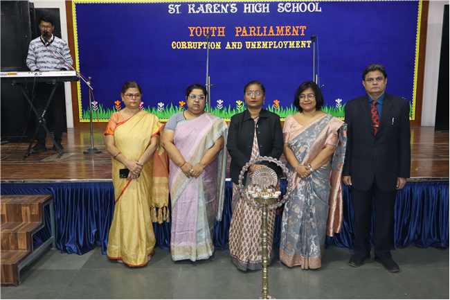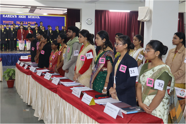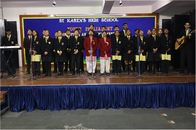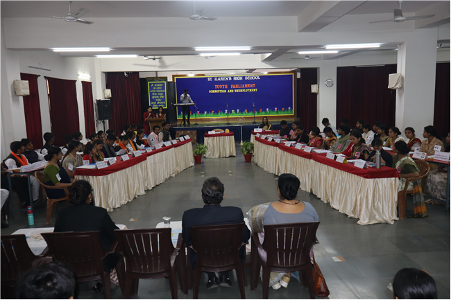 Description: The National Youth Parliament was conducted at St. Karen's High School on National Constitution Day, engaging students from grades 9 to 11. The session began with a general speaking followed by question hour, setting the stage for a vibrant deliberation on the agenda: Corruption and Unemployment. Student representatives participated as members of both the government and the opposition. The ruling party advocated for the implementation of various policies aimed at combating corruption and increasing employment opportunities. The Leader of the House delivered the opening statement, outlining the government's initiatives to address unemployment and foster economic growth. The opposition, however, presented strong counterarguments, highlighting the adverse effects of rising inflation, corruption, and the alleged misuse of government departments on national development and citizens' rights, including freedom of speech and expression. The first session concluded with the debate focused on the persistence of corruption and unemployment. The opposition urged the government to reconsider certain policies, such as the Agniveer scheme and the privatization of railways. With this, the session was adjourned. Following a brief recess, the second session resumed with a more intensified debate that expanded to cover additional dimensions of the agenda. The audience also actively participated by posing questions. The ruling party introduced the Pradhan Mantri National Research and Innovation Bill, 2024. This segment of the session centered on extensive discussions about infrastructure development, fostering innovation, and promoting research-oriented academic initiatives. After a detailed deliberation, the bill was put to vote, marking the conclusion of a dynamic and thought-provoking Youth Parliament. The participants were Shaurya Singh as prime minister, Abhinav as home minister, Kushagra as Health and family welfare minister, Rana Harshit as Minister of road and transport, Pranjal as finance minister, Amrit as ministry of external affairs, Padmaja as Bansuri Swaraj, Nandini as Ministry of Women and Child development, Pratik Raj as kiran Rijju, Ambar Sinha as Rahul Gandhi and many more, total 46 students were participants.