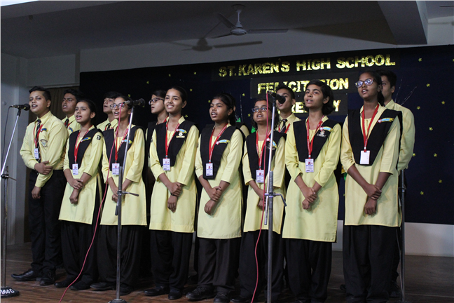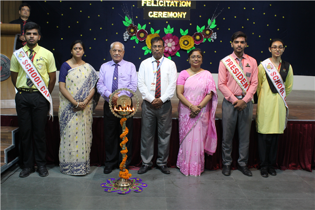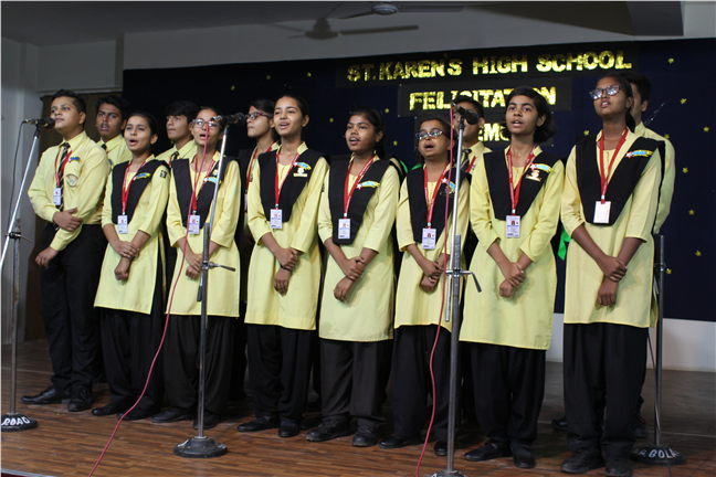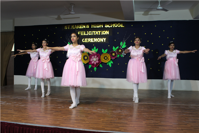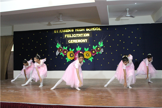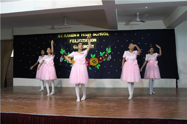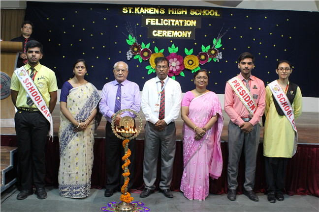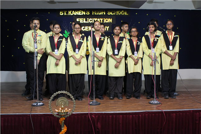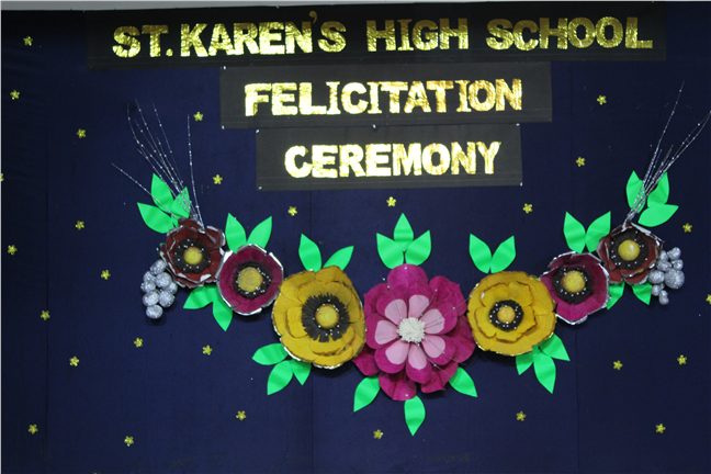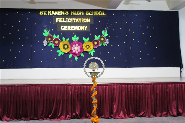 ON JUNE 30TH, THE FELICIATATION CEREMONY WAS HELD AT ST.KAREN'S HIGH SCHOOL, TO HONOUR THE MERITORIOUS STUDENTS OF STD. X AND XII FOR THEIR OUTSTANDING PERFORMANCE IN ACADEMICS AND SPORTS. THE CEREMONY BEGAN WITH THE LIGHTING OF THE CEREMONIAL LAMP BY NONE OTHER THAN OUR HON'BLE DIRECTOR MR .D.P. GALSTAUN FOLLOWED BY THE PRINCIPAL MRS. SEEMA SINGH AND VICE PRINCIPAL MRS. ANJANA JAMES.
