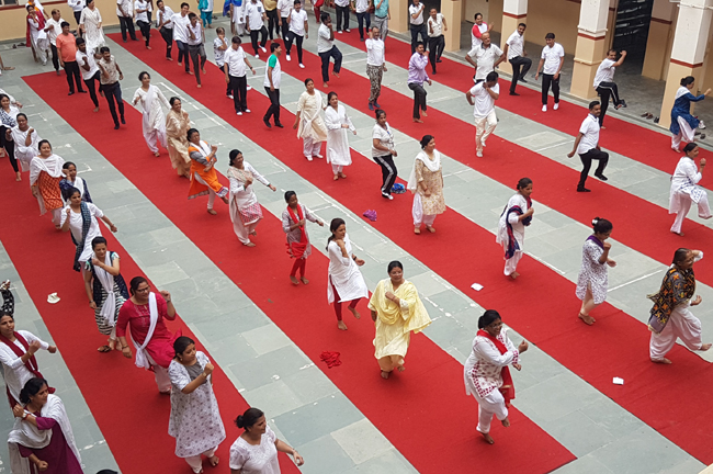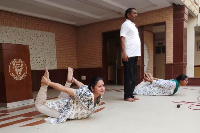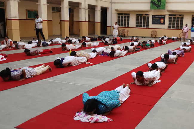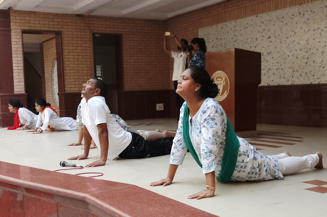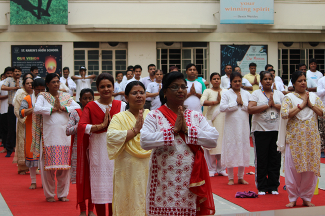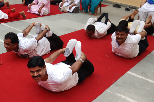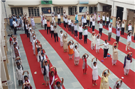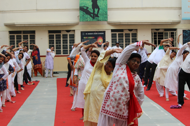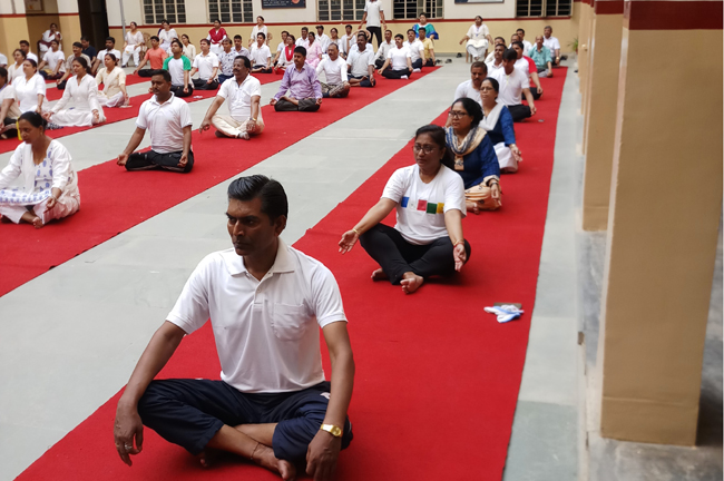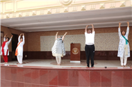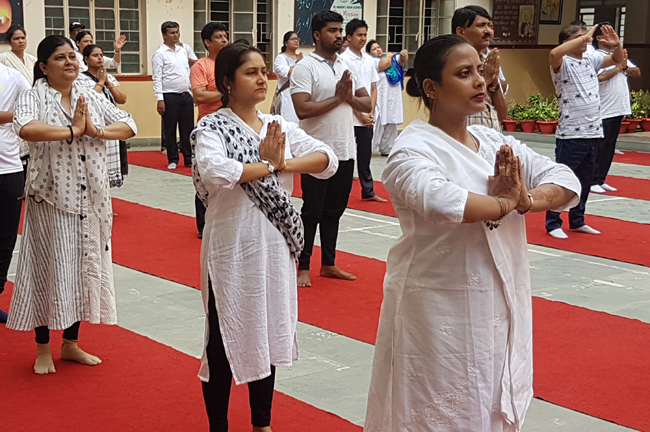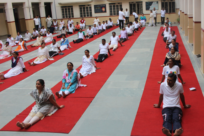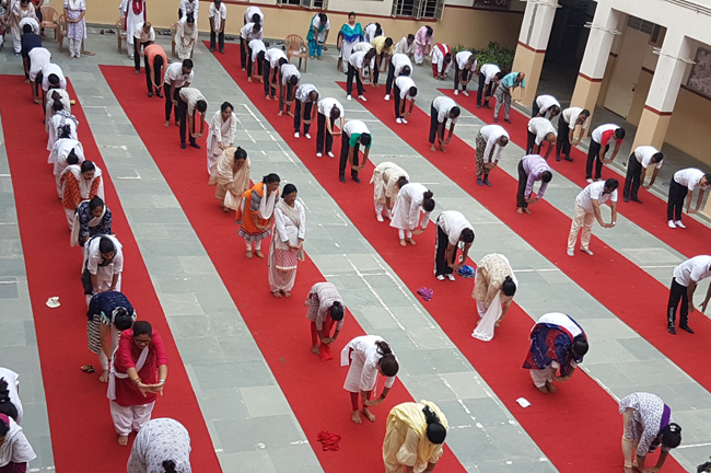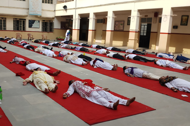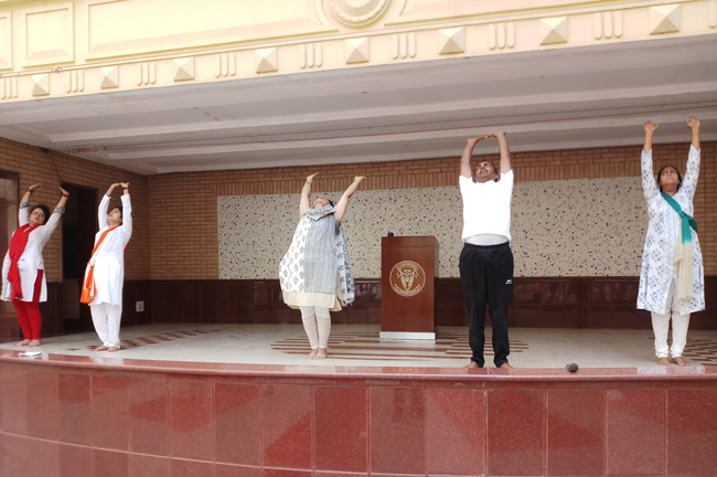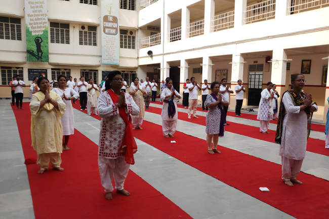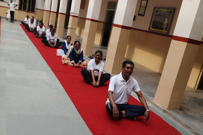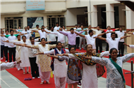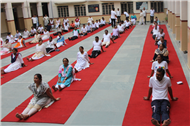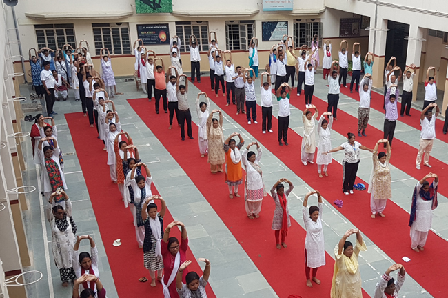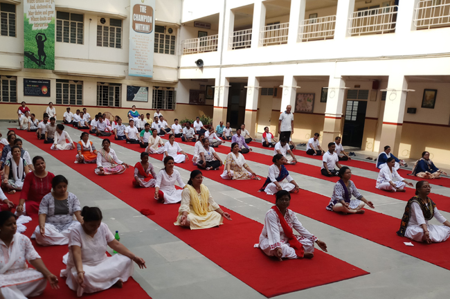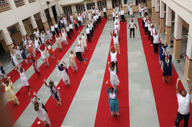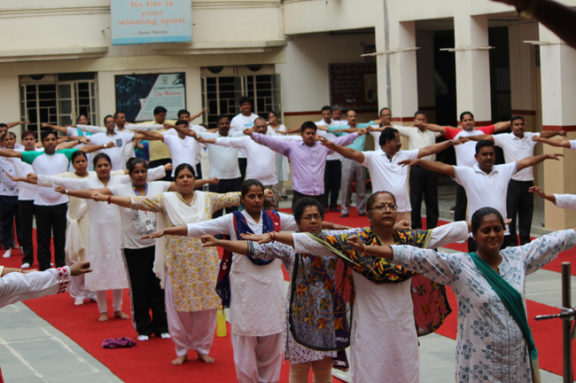 Description: The International Yoga Day was celebrated in the school on 21st June 2019. The Sports Incharge Mr Kuldeep Yadav and Mr Manoj Kumar started the programme by discussing the importance of Pranayama. The contribution of Yoga in maintaining fitness and good health was understood by all the teachers, which reflected in their active participation in the Event. Yoga to control Sugar Levels and to increase Flexibility level were demonstrated.