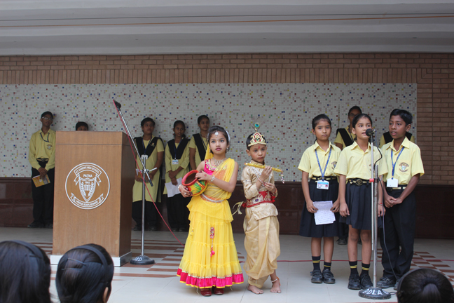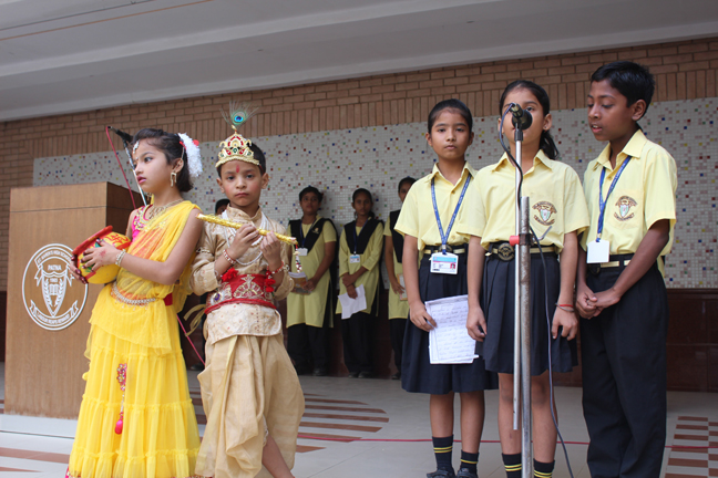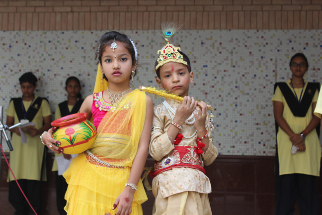 Description: Festivals are an expressive way to celebrate glorious heritage,culture and tradition. The primary wing students brought forth the true meaning of the festival of Janmashtmi on 24th August,2016 which commemorates the earthly arrival of Lord Krishna. They disguised themselves as Lord Krishna and Radha.There was enormous enthusiasm among the students.They read about its significance as a festival which encourages goodwill and togetherness and how it is celebrated with pomp and splendour all over India.