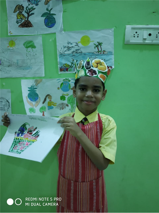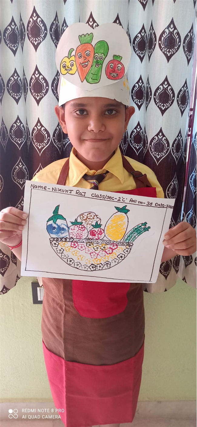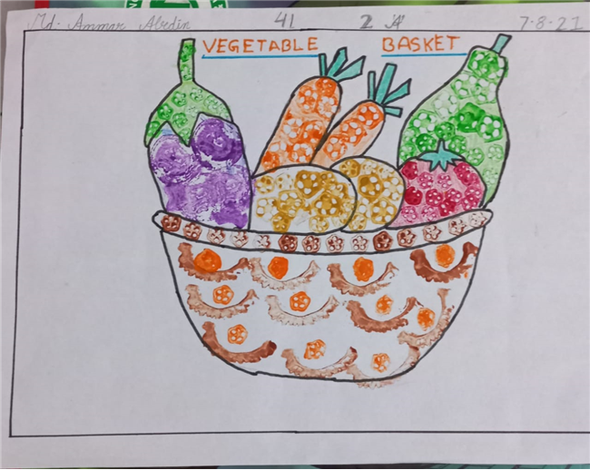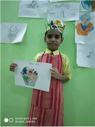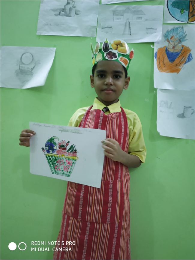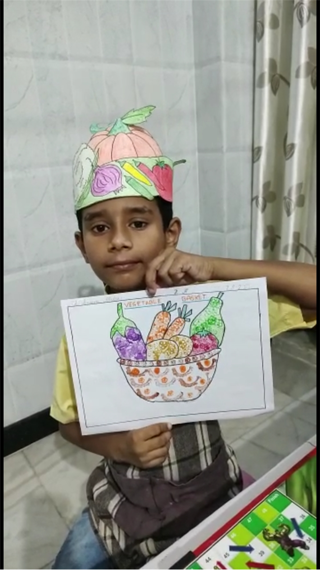 Description: The students of St. Karen's High School have proved that lockdown can't lock their creativity. Even the tiny tots have proved the same. A virtual vegetable printing competition was organised for the students of Class II of St. Karen's High School on 7th August 2021. There were twelve participants in the event. The event was organised by the members of The Art and Craft Club-Ms. ShaguftaParveen, Ms. Ashima Bishop, Ms. Seema Roy, Ms. Shyamli and Ms. Julie. The programme was thoroughly successful. The students participated with much enthusiasm wearing vegetable caps and aprons and had colourful backgrounds. They used vegetables for printing with vibrant colours. The programme was judged by the Co-ordinator Mrs. Rinku Banerjee. The event was much appreciated by our Academic Head, Mrs. Sharon Galstaun and our Principal Mrs. Seema Singh.The vote of thanks was proposed by Ms. Seema Roy.