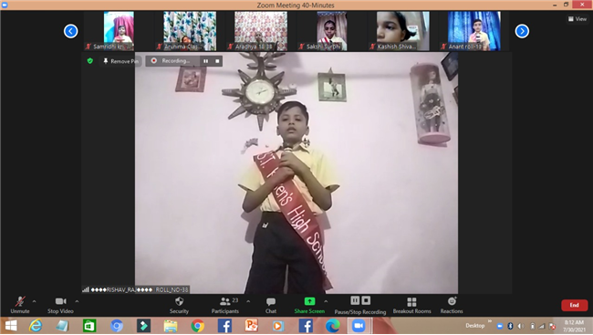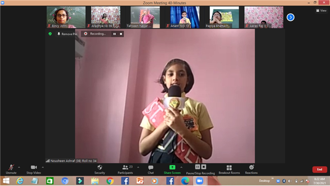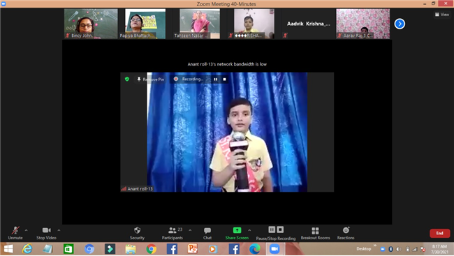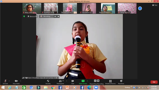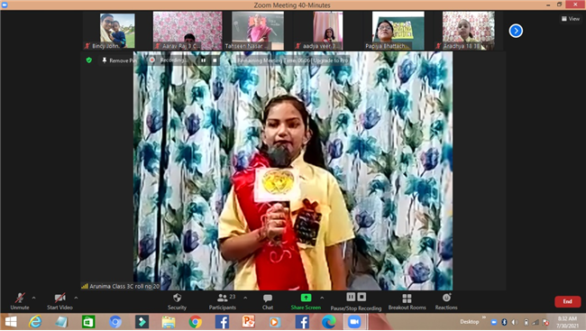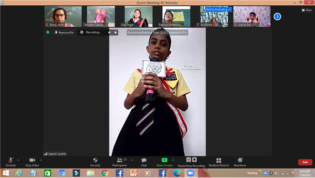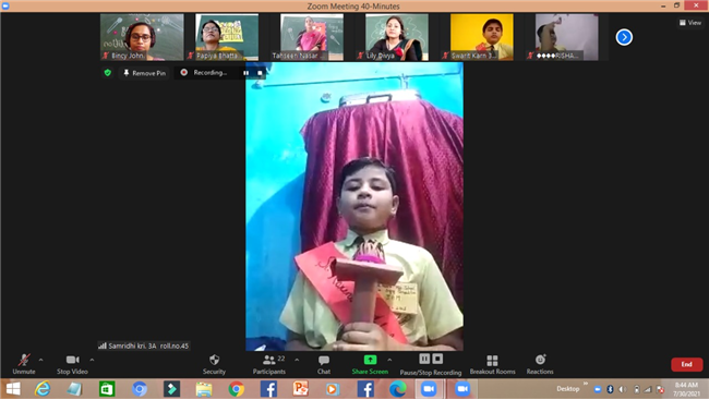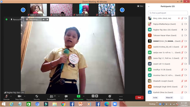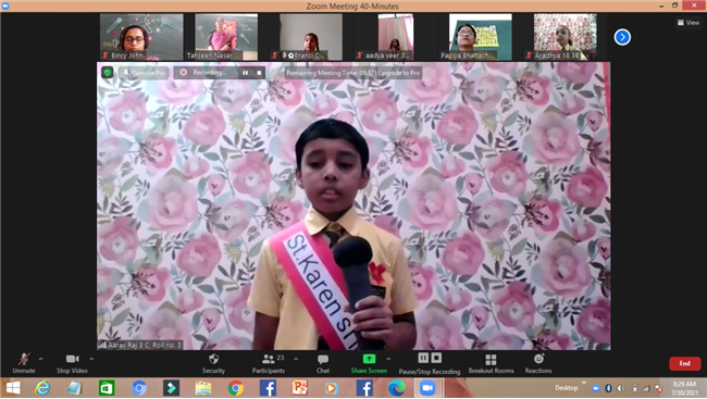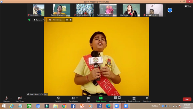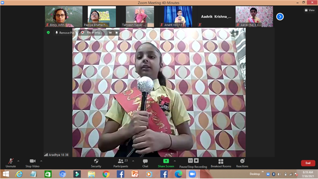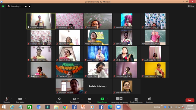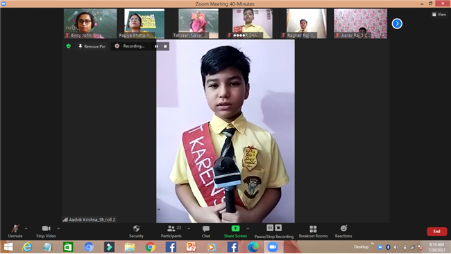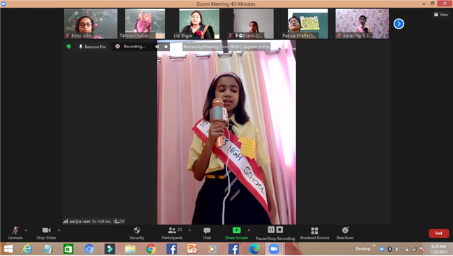 Description: "Music binds our soul, hearts and emotions. It cheers the spirit and lightens the heart". To bring out the singing talents of students, a Solo Singing Competition was organized by “The Dance and Music Club” for the students of class III on 30th of July,2021. The theme for the competition was English Prayer Song. 15 participants from all the three sections put forth their enthralling performance. The children sang the songs with confidence and passion. The mellifluous songs pulled the heartstrings of the audience . The programme was successfully conducted in the presence of our Academic Head Mrs. Sharon Galstaun, Principal Mrs. Seema Singh , the Club Members Ms. Papiya Bhattacharya , Ms. Lily Divya, Ms. Geetanjali Singh, Ms. Tahseen Khan and Ms. Bincy John. The judges for the event were Mr. Robert Sam and Ms.Bincy John. All the students were well appreciated by the Academic Head and the Judges. The 1st prize went to Aradhya of Std. 3 B , 2nd to Aadya Veer of Std. 3 C and 3rd to Aadvik Krishna 3B.