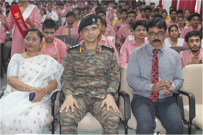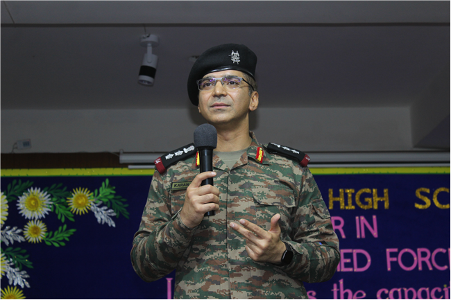 The event started with a standing ovation given by the students of class 12th and the teachers as the chief guest and speaker Colonel Karan Mehta stepped on the stage to address the audience. The colonel introduced himself as a 4th generation army officer who is a satellite analyst and a leading officer in the ‘Armoured Corps’ of T72 tanks at the Siachen Glacier.