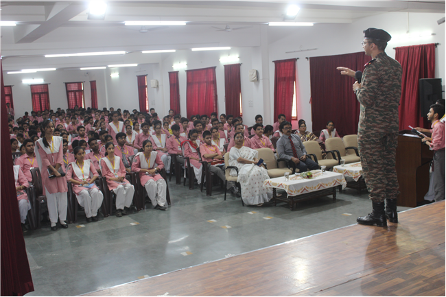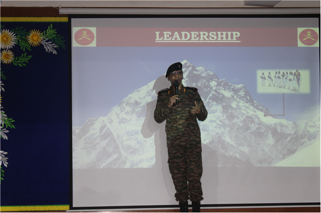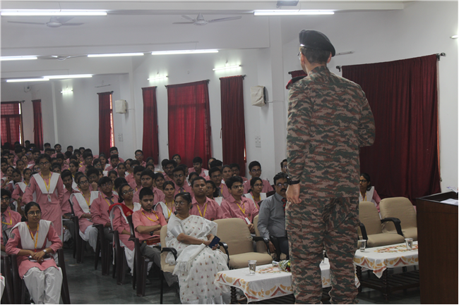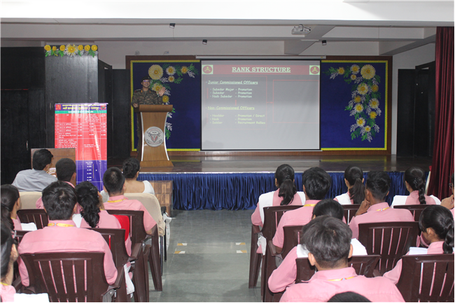 An in depth knowledge about the Indian Army was given to the students. A variety of related topics were discussed. The presentation started with the qualities and eligibility needed by the students to be accepted into the army. Then it continued with the benefits received by it and necessary tips and steps to be taken to pass the gruelling entrance examinations. Finally, the presentation concluded with the motivational words of the colonel.