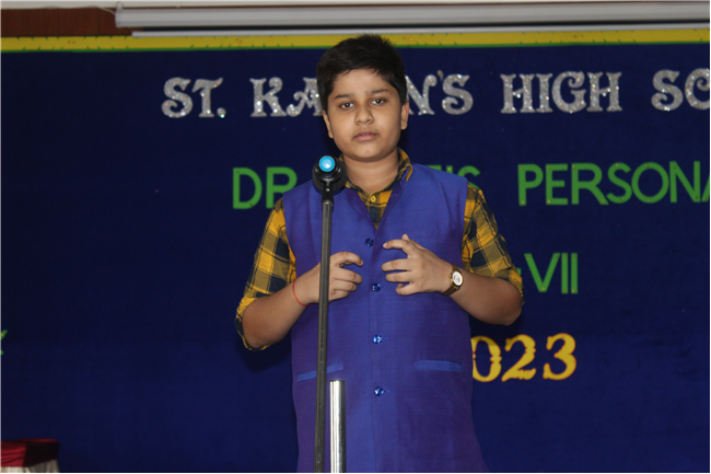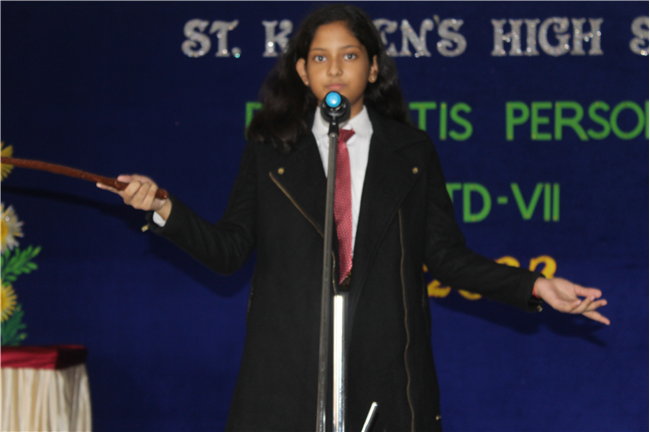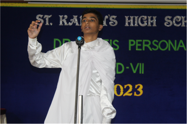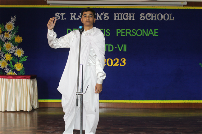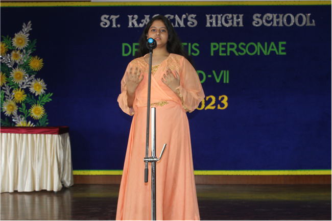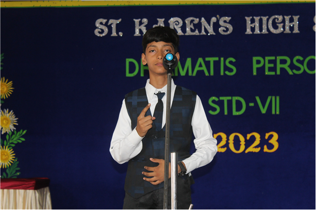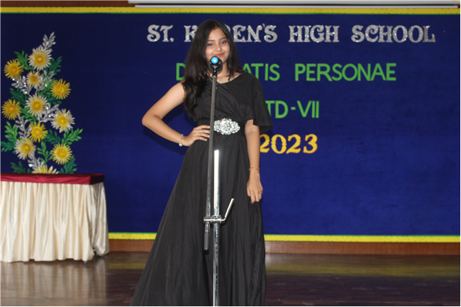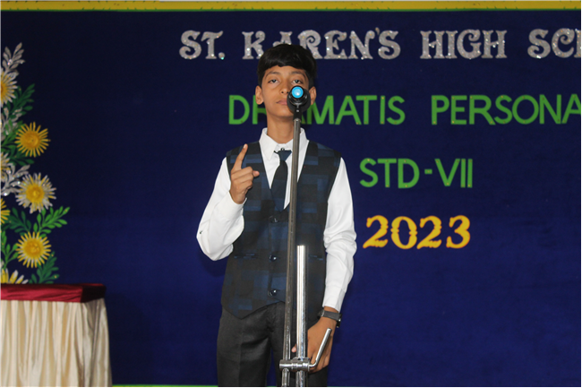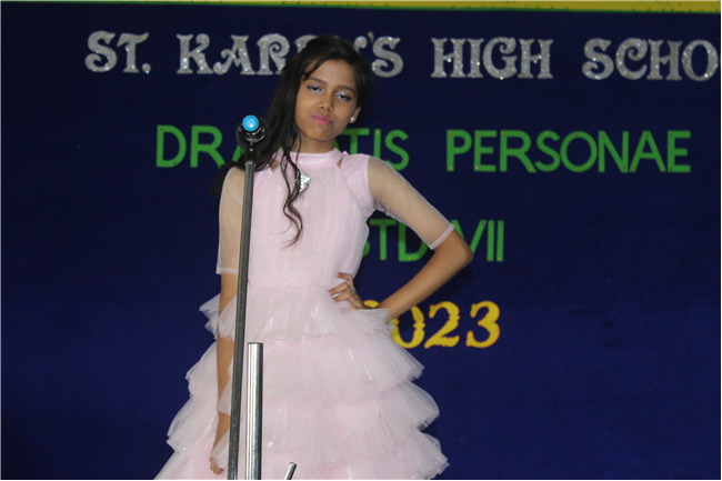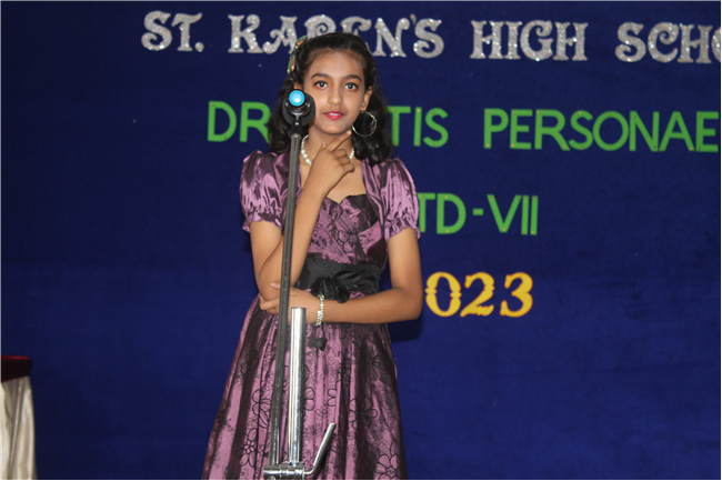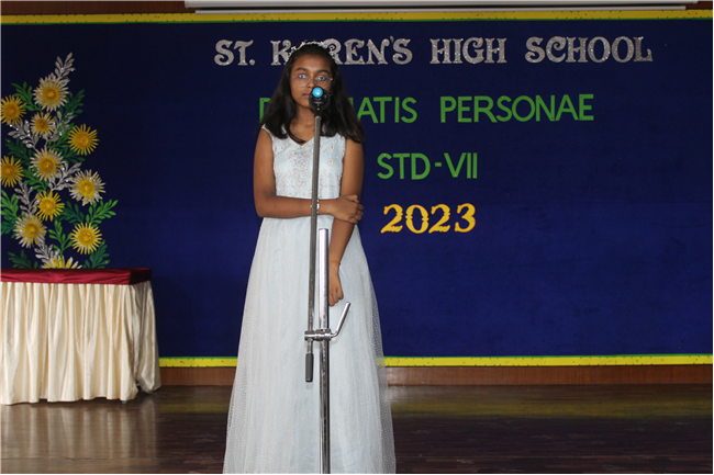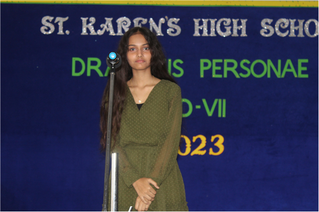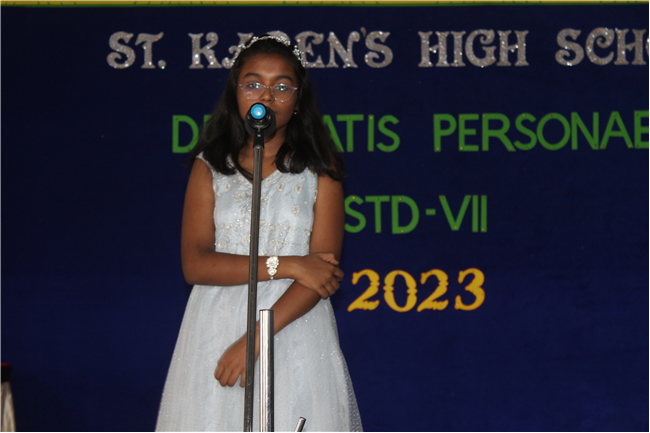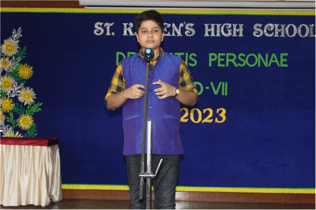 Description: A character dramatization competition was held for the students of std. 7 on Tuesday, 29th August2023 in Pamela Hall. Children came dressed up in their favorite literary characters like Harry Potter, Mare Anthony, Helena, Hermione Granger, etc. The passionate enactments were appreciated by everyone present. The revered judge’s Debleena Miss and Seema R Joseph congratulated the students on their wonderful performance and encouraged them to showcase their innate talent. The winners were as follows: - (1st – Aashna Kashyap), (2nd –Anjali Sawan), (3rd – Mandavi Singh and Sakaar Raman).