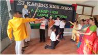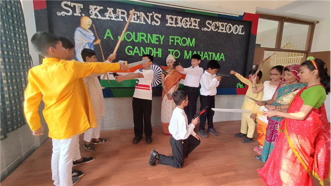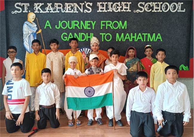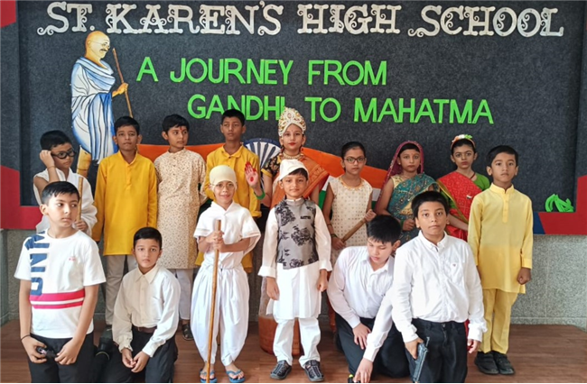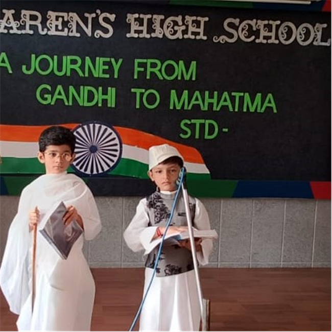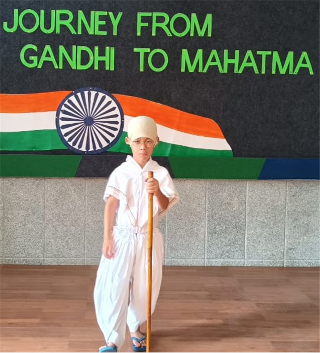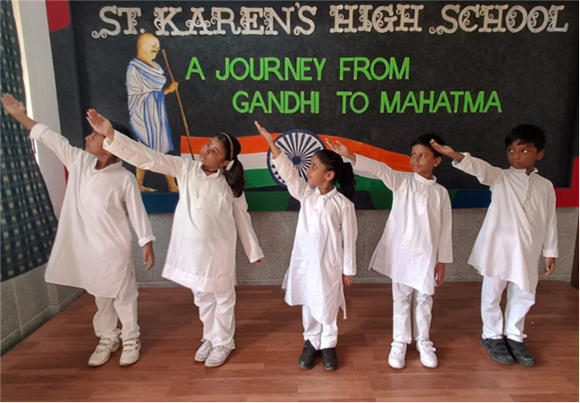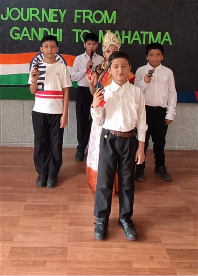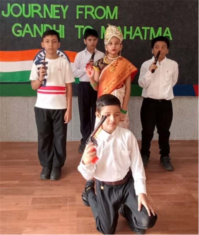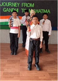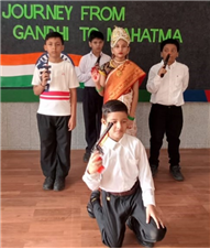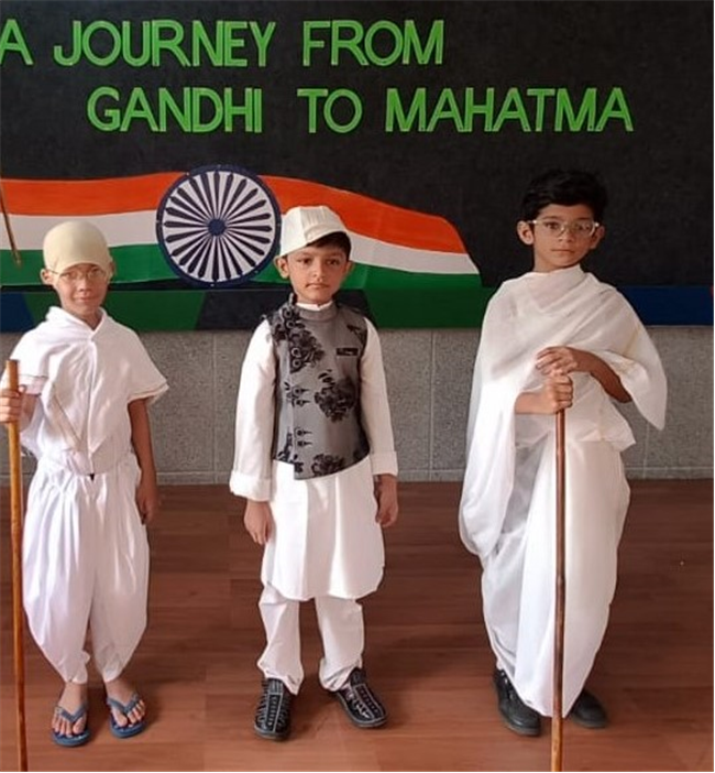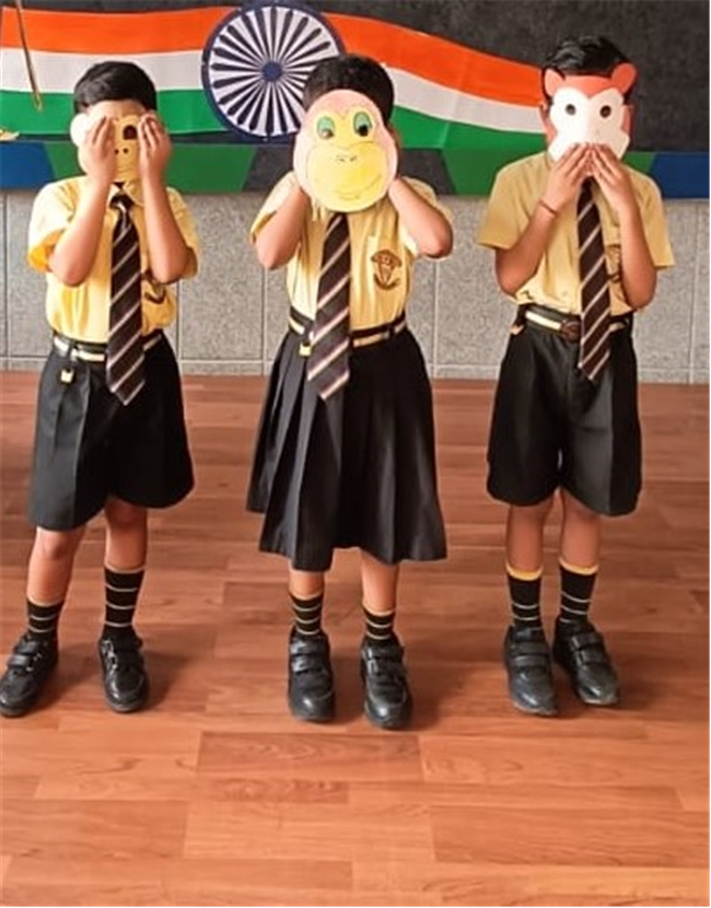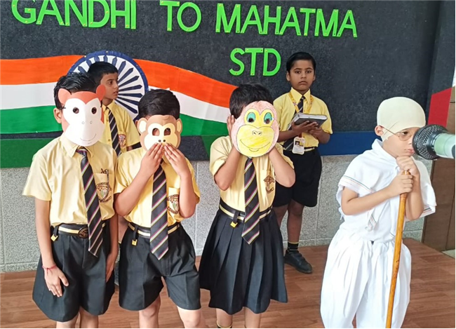 An assembly was organized with the purpose of enlightening the children about the significance of celebrating October 2nd as the birthdays of both Gandhi and Lal Bahadur Shashtri. The students dressed up as Gandhi ji and Shashtri ji, while those from standard 3 performed a short skit illustrating the Quit India Movement. Additionally, students from standard 1 dressed up as the three monkeys of Mahatma Gandhi and Lal Bahadur Shashtri. They also delivering a delightful dance performance. The rendition of the song "Raghupati Raghav Raja Ram" filled the air with a profound sense of pride in our Indian heritage.