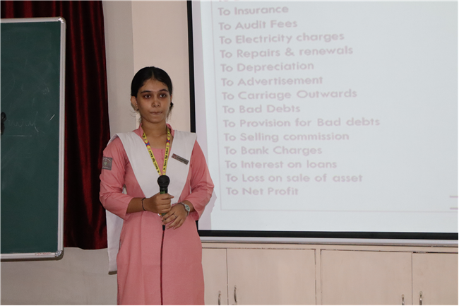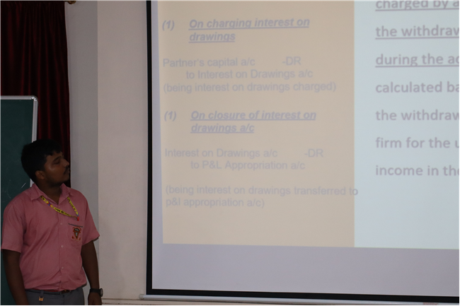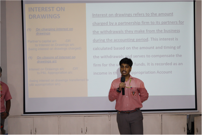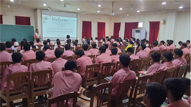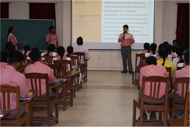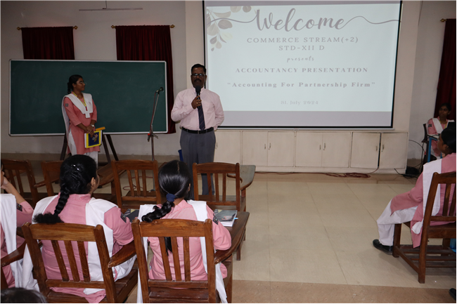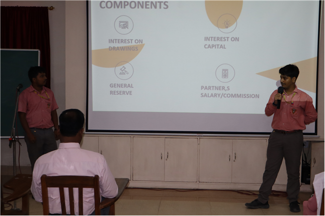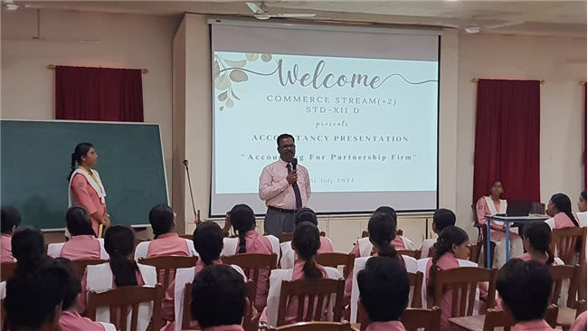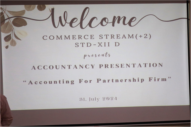 Description: On July 31st, 2024, the Commerce stream of +2 students organised a comprehensive PowerPoint presentation on the topic "Accounting for Partnership Firms". The presentation covered essential concepts, including:- Basic concepts of partnership firms, - Accounting principles and practices,- Distribution of profit and loss, - Valuation and treatment of goodwill, - Calculation of new ratio, sacrificing ratio, and gaining ratio. The event was well-attended by commerce students, who gained valuable insights into the world of accounting and its practical applications.