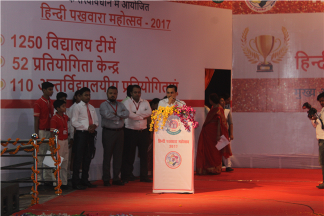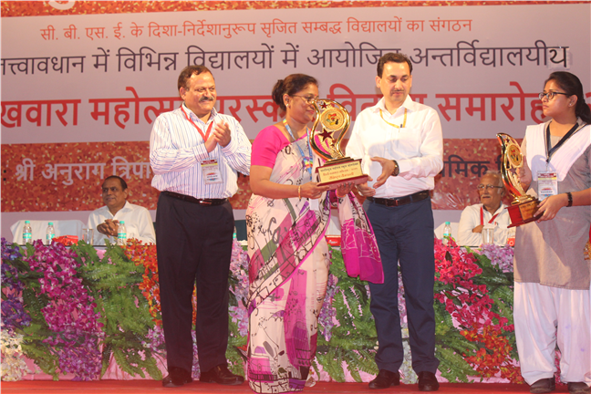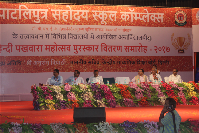 Description: Hindi Pakhwada Mahotsav was celebrated by Patliputra Sahodaya. 1250 School teams participated in 110 events spread over at 52 centres all over Bihar .Karenites exhibited outstanding performance in the Hindi Pakhwara Divas held in the month of September. They won the first position in many events conducted by different schools of Patna. The Award giving ceremony was organised at S.K.Memorial Hall. The chief guest was Mr Anurag Tripathi, Secretary, CBSE, New Delhi. He congratulated the students for their exemplary performance and also appreciated the effort of Mrs Seema Singh, the Principal, in motivating the students to take interest in such events. The following students were felicitated- 1. Recitation - Nishant Kumar - IX D - Third position 2. Poetry Recitation - Swati Shri - IX J - First position & Nishant Kumar - IX D - Second position 3. Poetry Recitation - Abhinav Anand - VIII D - First position and Palak Ambast - VIII A - Second position 4. Dinkar's poetry - Anant Verma - XII D - Second position 5. Letter Writing - Palak Ambast - VIII A - First position 6. Poster Making - Sudhanshu Shehar - X J - First position 7.Debate - Sanidhya Sinha - XC - First position & Yashwi Singh X E - First position 8. Rangoli Making - Ishita Dutta, Rituraj Yashaswani and Sarthak Singh Sagar.- First position 9. Dohas of Kabir - Swati Shri - IX J.- First position.