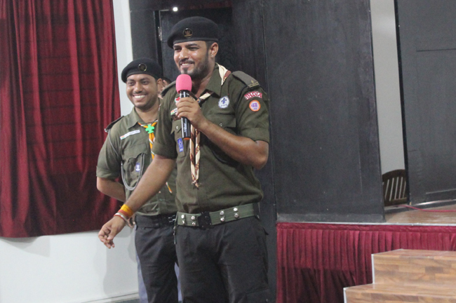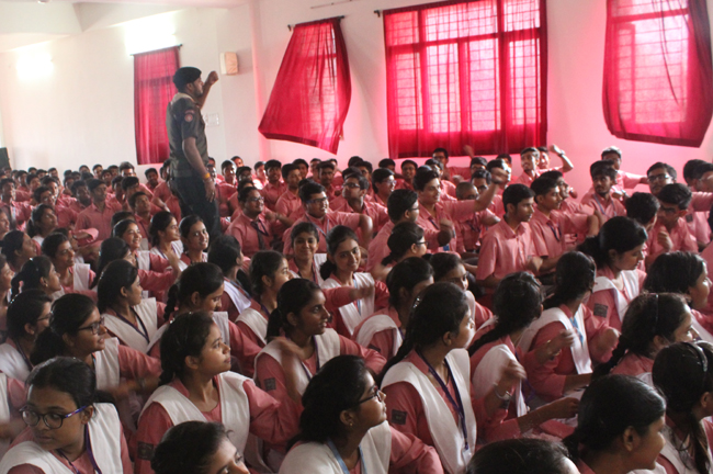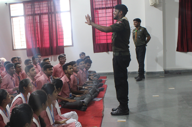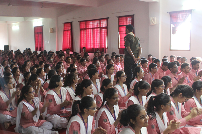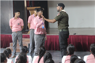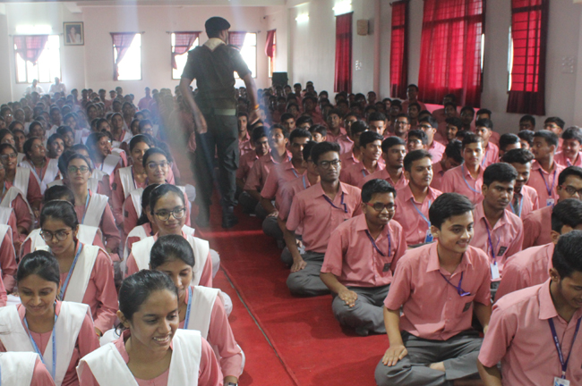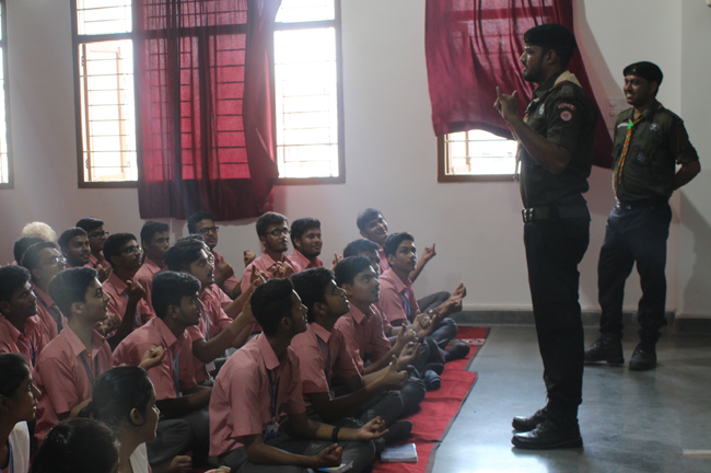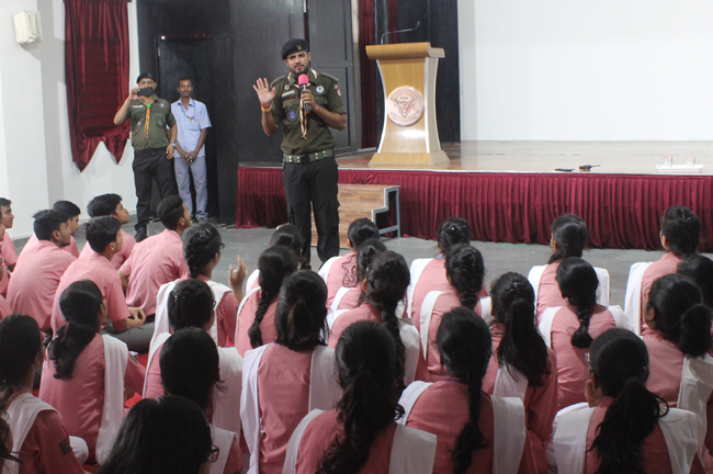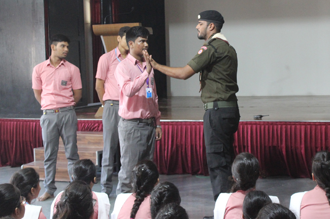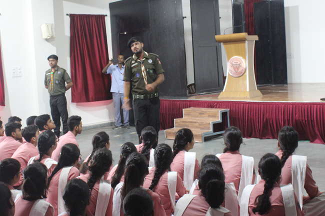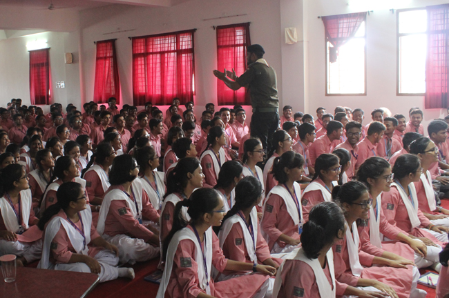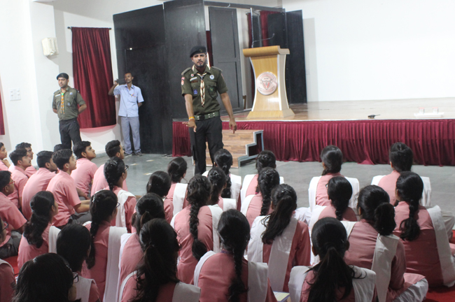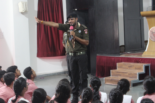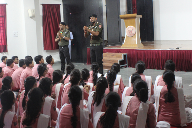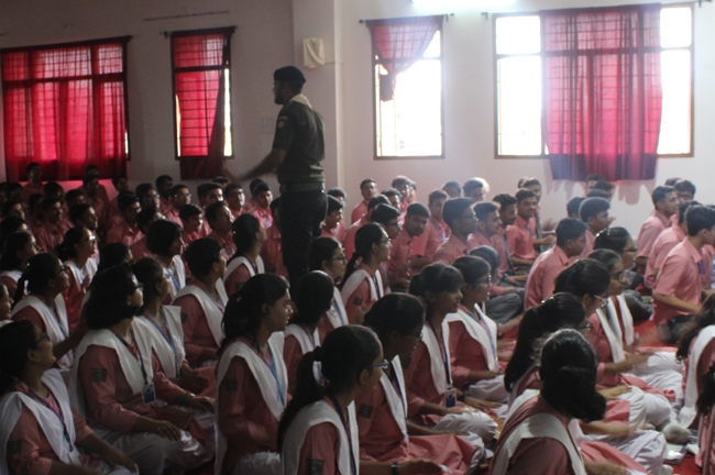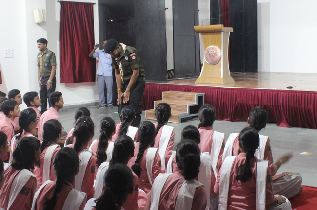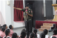 Description: A demonstration of the Scouts and guides movements and its importance was conducted for the students of class VII,VIII, IX, XI and XII on 29th July 2019. They guided the students about emergency measures to be undertaken during natural disasters. The experts discussed about the lifestyle of soldiers who live with minimum facilities in extreme conditions. The students participated enthusiastically and recited the couplets of the army.