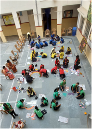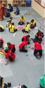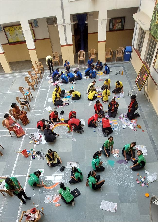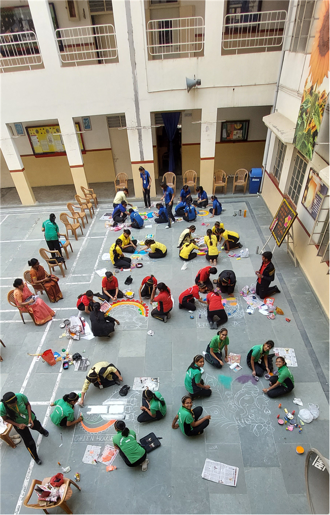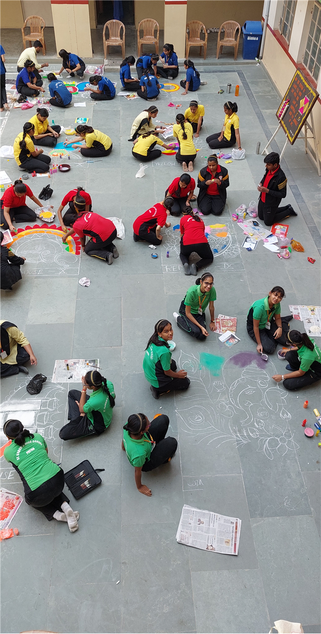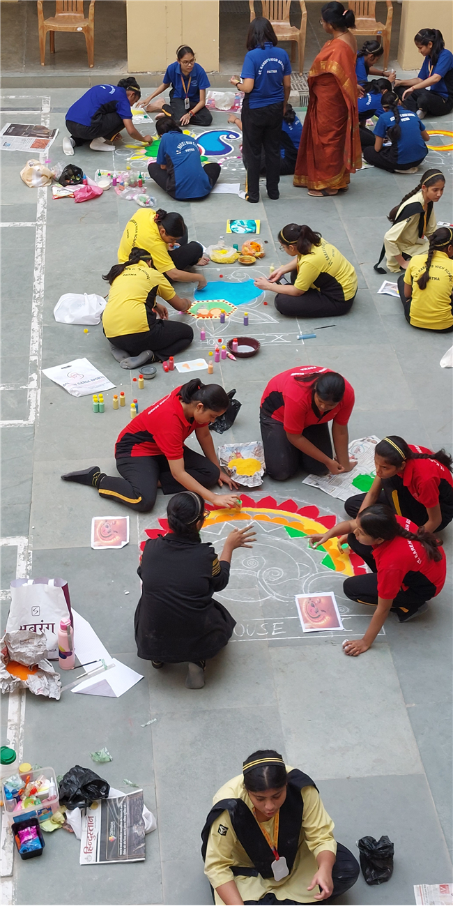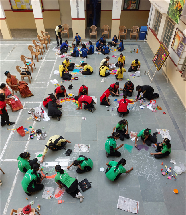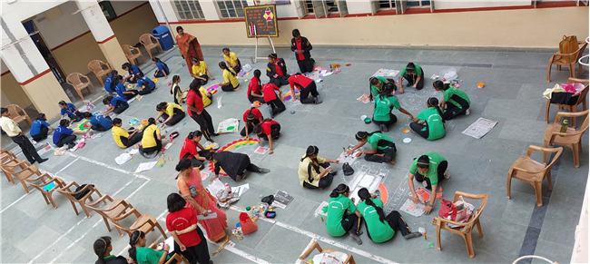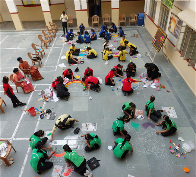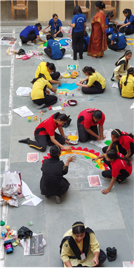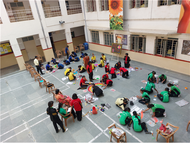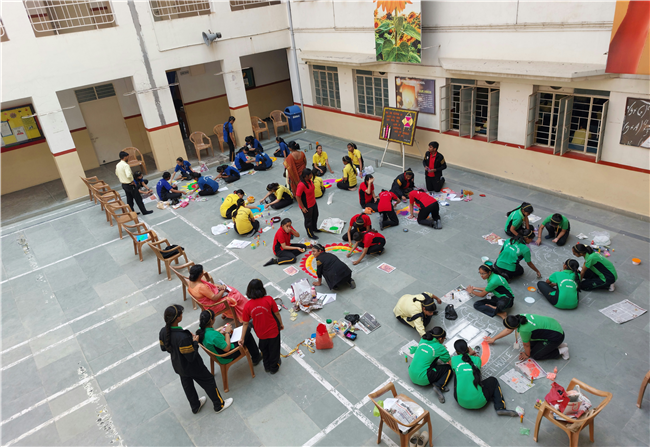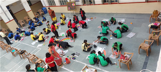 A Rangoli Making competition was held on 9th November, 2023 in the quadrangle for students of classes 9 and 10. Students actively participated in the competition & showcased their creativity. The Rangoli made by them were colorful & innovative. The Rangoli displayed manifold patterns filled with bright, pleasing colors. The students learn and practiced a traditional form of art. Principal Ma’am appreciated the students for their efforts.