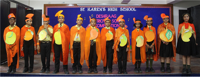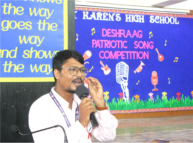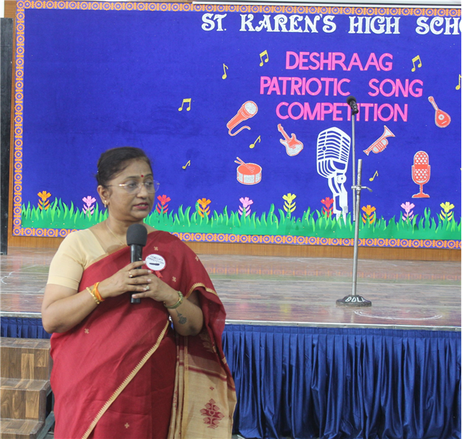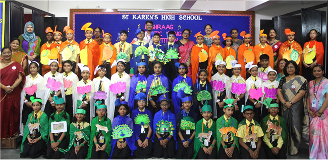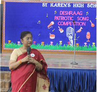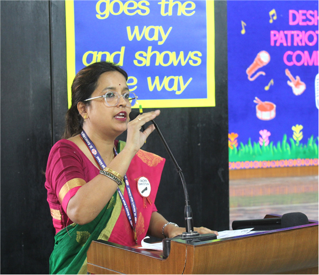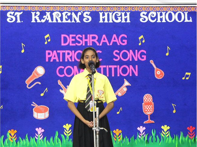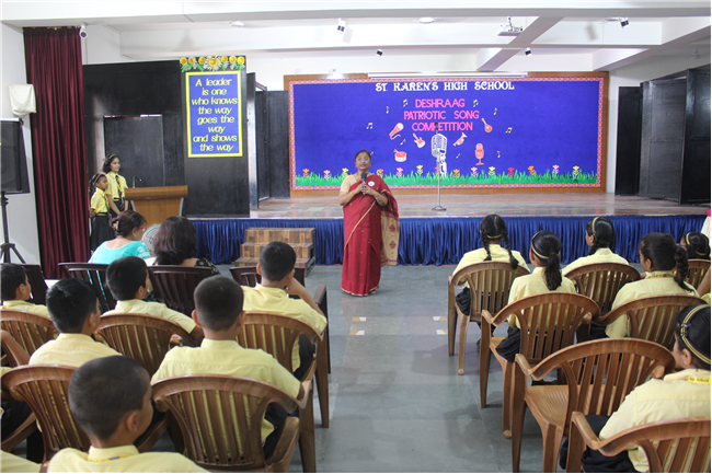 Description: Students of std 5 participated in a patriotic singing competition. Each team which comprised of 8- 10 members, represented one National symbol. Like... Mango, Lotus, Peacock and Tiger. Children sang melodious songs. As fillers, Std 1 and 2 students presented the fashionista. They represented different states of India and did a Ramp walk The winner of The patriotic singing competition is Std 5B