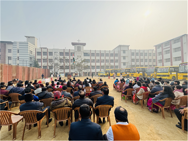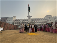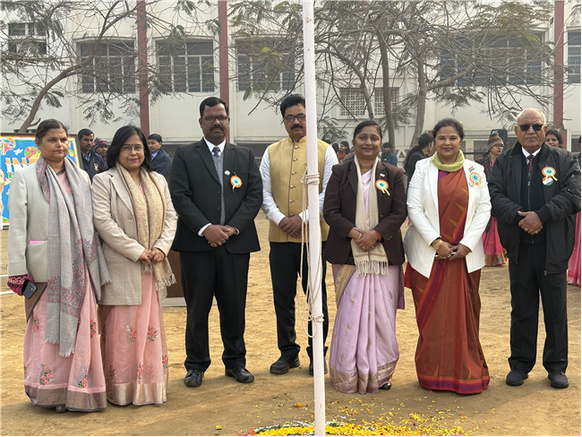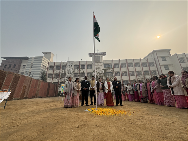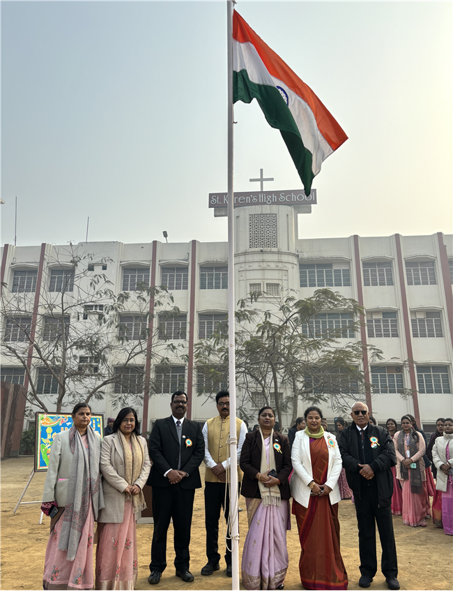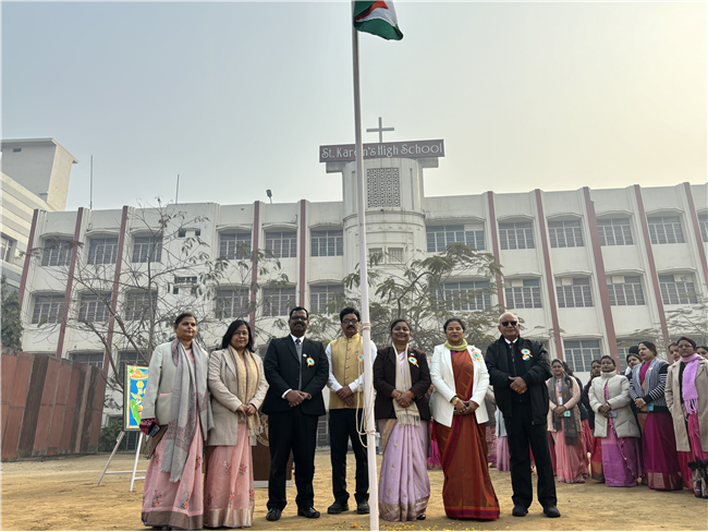 Description: The 75th Republic day was celebrated at St. Karen's high school with great enthusiasm. The programme started with the hoisting of the tricolour by Director Sir, Shefali Ma'am and Seema Ma'am followed by the national anthem. Richa Thakur Ma'am in her welcome speech highlighted the importance of the day by narrating a poem in Maithili followed by a patriotic song ‘Ae mere watan ke logon’ sung by Papiya Ma'am. Next was a speech in Hindi by Rakhi Ma'am in which she spoke about the sacrifice of our freedom fighters and the contribution of our leaders in making of the Constitution. Preeti Ma'am spoke about Major Somnath Sharma one of the recipients of Paramvir Chakra followed by patriotic song sung by the students. Next came the much-awaited programme of the day conducted by Principal Ma’am - the Quiz in which everyone- students, teachers, office staff and even the support staff participated eagerly. Our Director Sir addressed the gathering on this occasion and appreciated the diversity in our country and also asked the students and teachers to have ambition in life and work on it in a planned way to be successful. Shefali Ma'am motivated the gathering with her words of inspiration. The programme ended with a vote of thanks given by Vice Principal Sir.