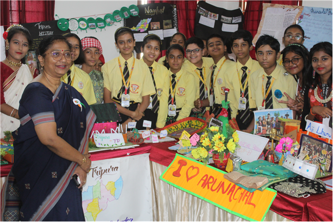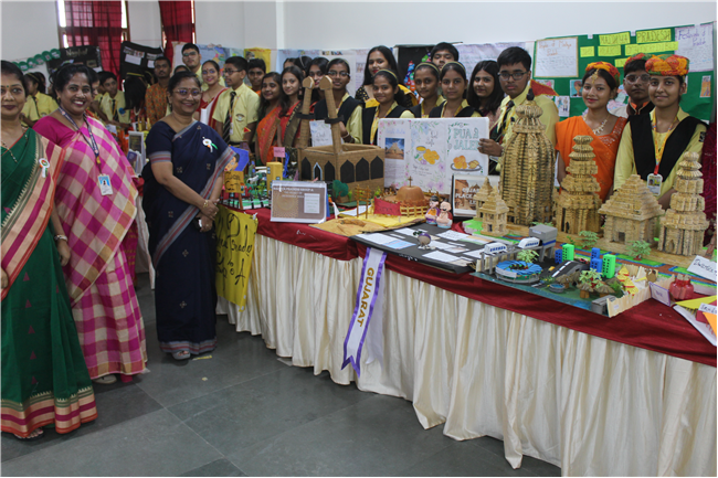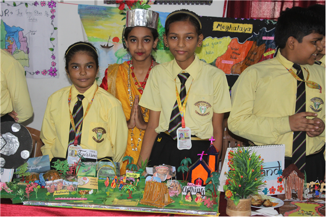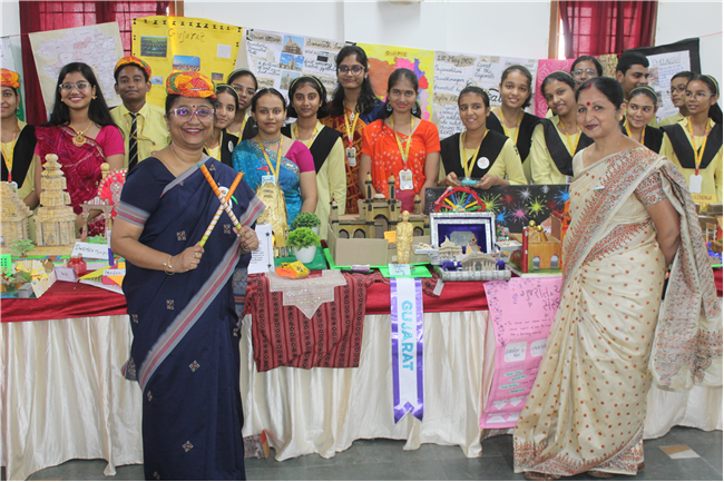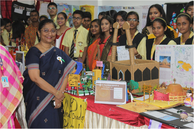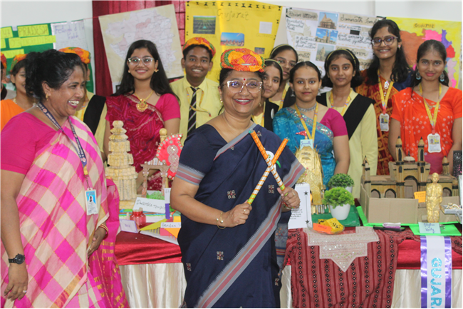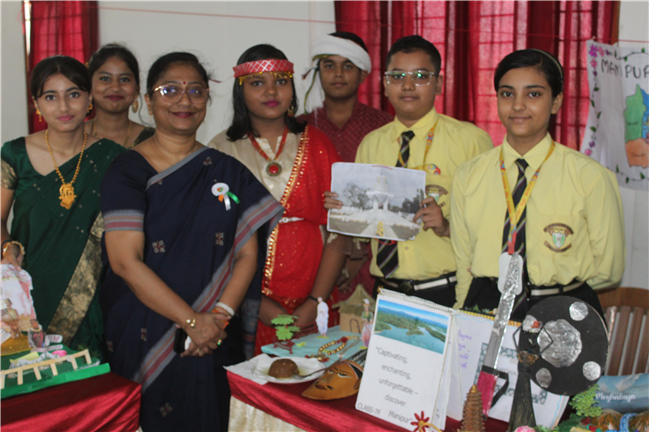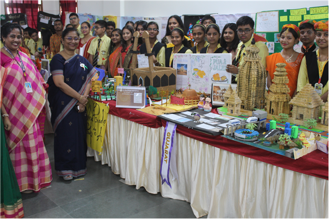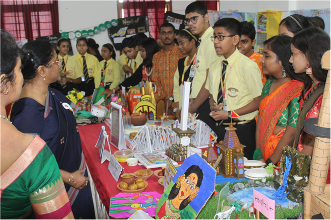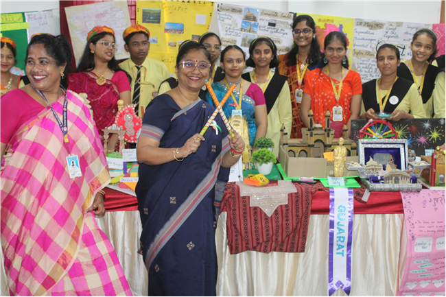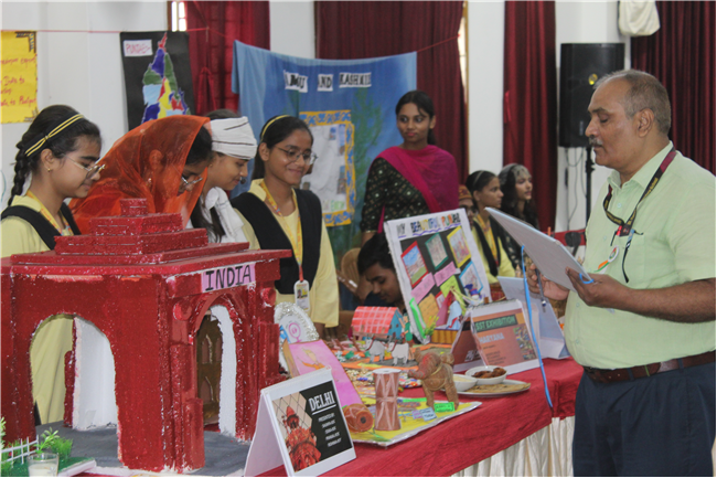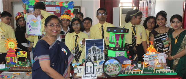 Description: The Department of Social Science organized an exhibition on October 10, 2023, featuring the active participation of students from Classes 6 to 9. The event commenced with the pinning of badges on the esteemed guests and the ceremonial lighting of the lamp, followed by a captivating digital presentation of the theme. The students skillfully presented the diverse cultures of different Indian states through models of monuments, cuisine, traditional attire, and more. These state-wise presentations beautifully showcased the unique and vibrant colors of each region. The exhibition transformed Pamela Hall into a microcosm of India, making it a cultural extravaganza worth celebrating.