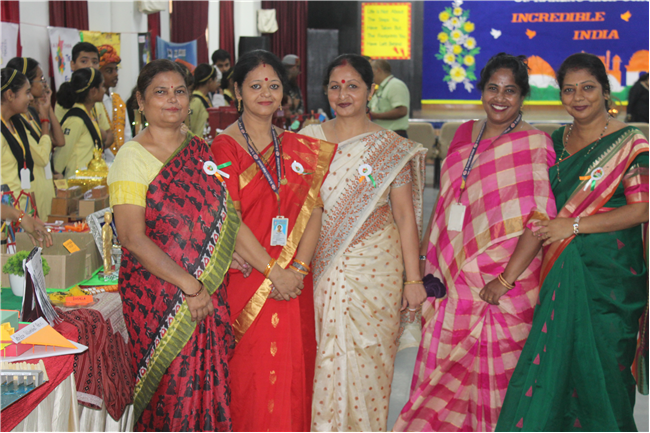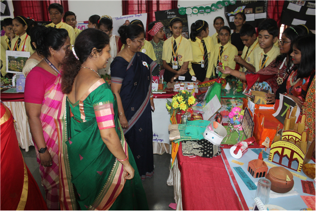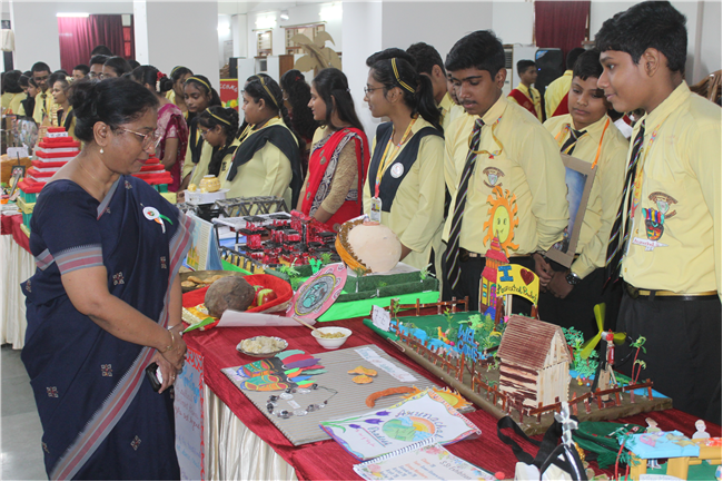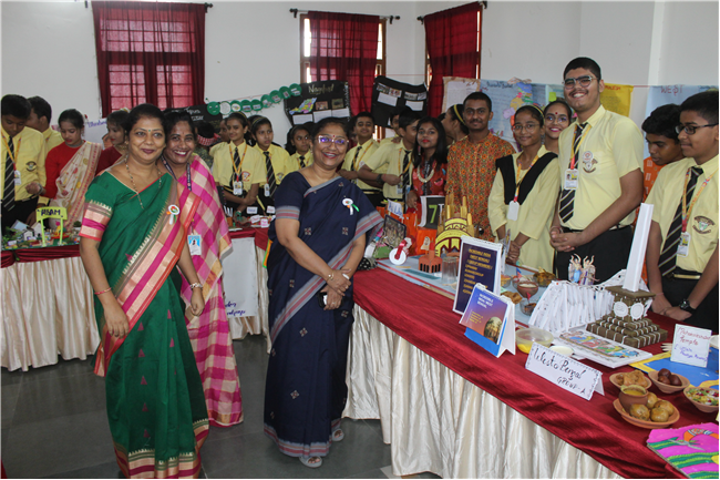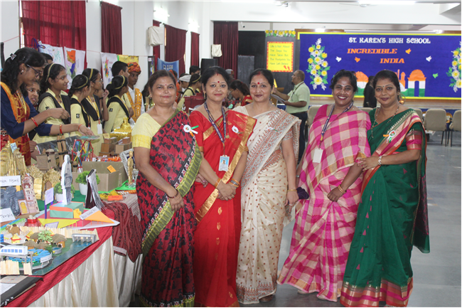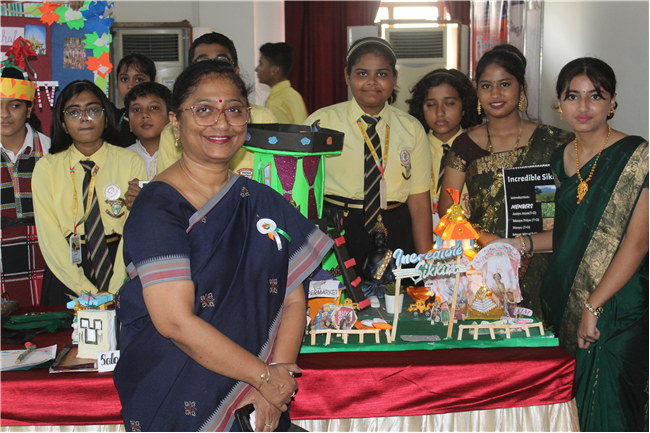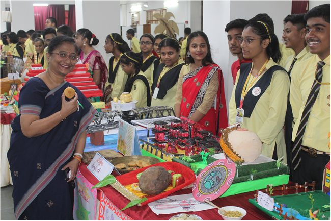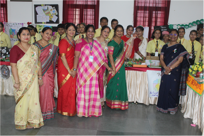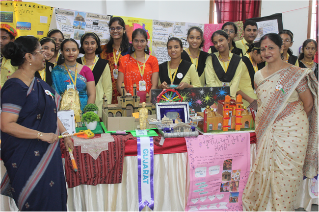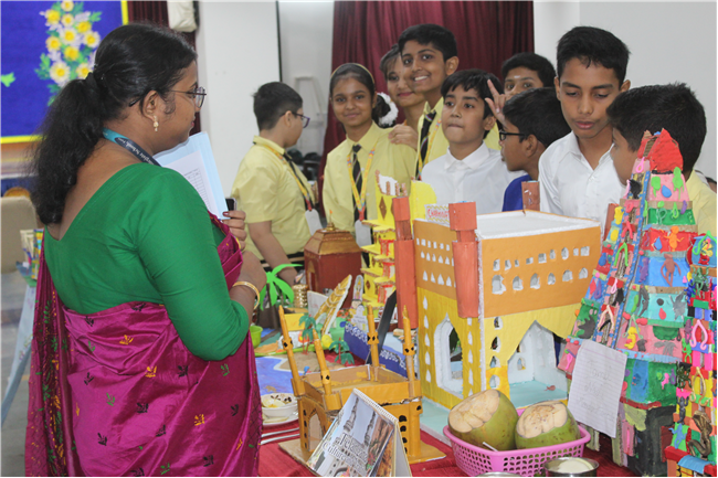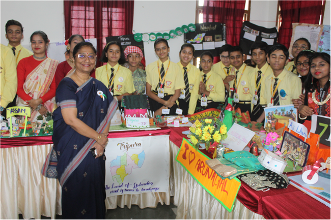 Description: The Department of Social Science organized an exhibition on October 10, 2023, featuring the active participation of students from Classes 6 to 9. The event commenced with the pinning of badges on the esteemed guests and the ceremonial lighting of the lamp, followed by a captivating digital presentation of the theme. The students skillfully presented the diverse cultures of different Indian states through models of monuments, cuisine, traditional attire, and more. These state-wise presentations beautifully showcased the unique and vibrant colors of each region. The exhibition transformed Pamela Hall into a microcosm of India, making it a cultural extravaganza worth celebrating.