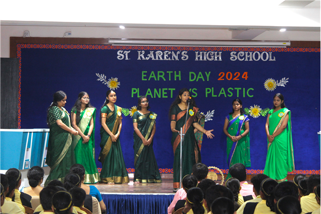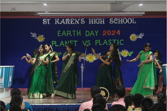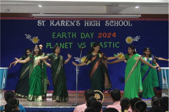 Description: St. Karen’s High school celebrated Earth day on 22nd April 2024. All the students from STD 1 to 12 participated in various activities that created an awareness towards saving the mother Earth. The day began with a special morning assembly by the Primary children, they presented a dance, skit and group songs followed by a painting competition on the topic “Earth Day”. The students from Std.6 to 10 participated and filled the colors of their imagination on papers. The best entries were given prizes and certificates by the Academic supervisor Ma'am and Principal Ma'am. A quiz contest was also organised for the students of Std. 8 to 12 teamed with a thematic dance, nritya natika and PPT presentation. Last but not the least STD 1 to 5 had classroom activities, in which all the students participated with enthusiasm.