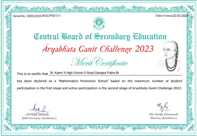 Rishav Kumar of std 10th was selected amongst the top one hundred student from Patna in the second round of Aryabhata Ganit Challenge 2023.